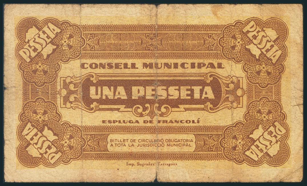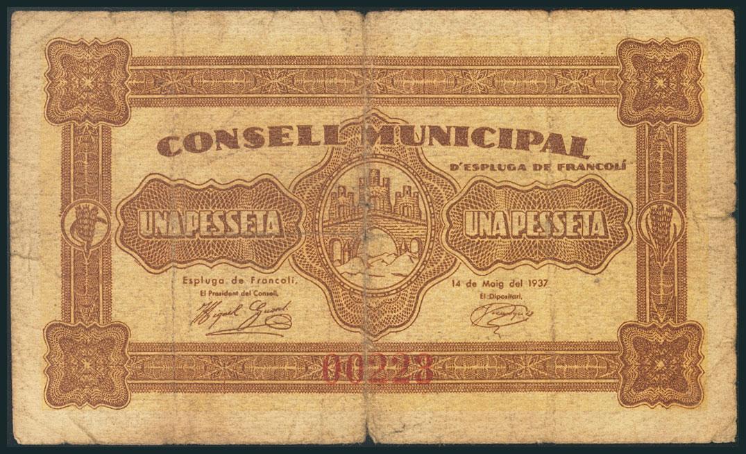 ESPLUGA DE FRANCOLI (TARRAGONA). 1 Peseta. 14 de Mayo de 1937. (González: 7773). RC.