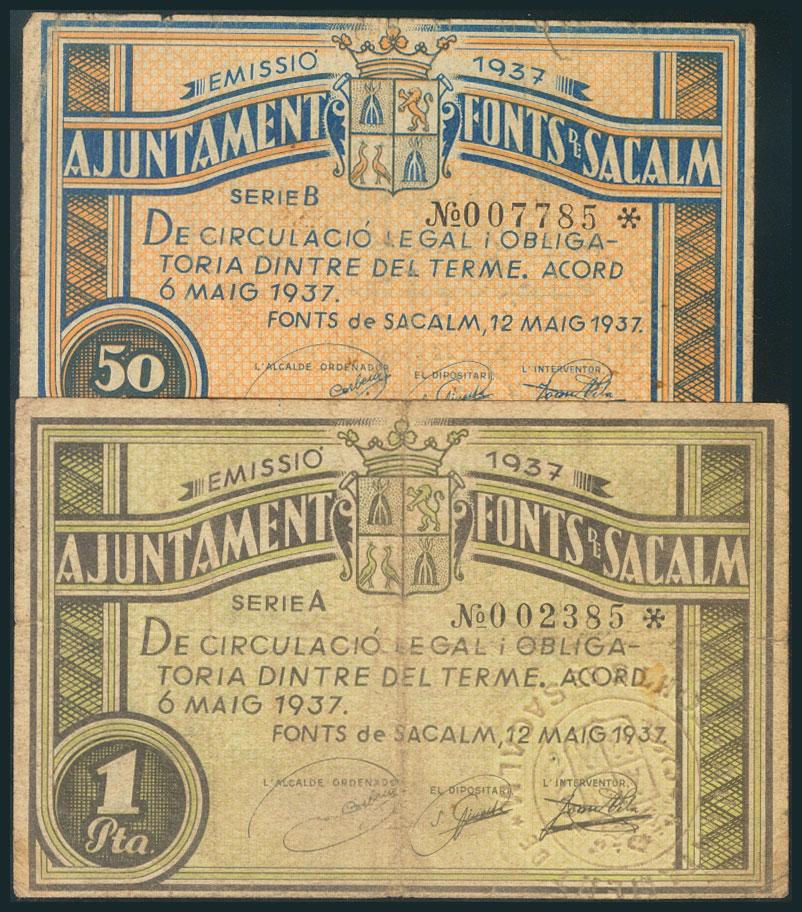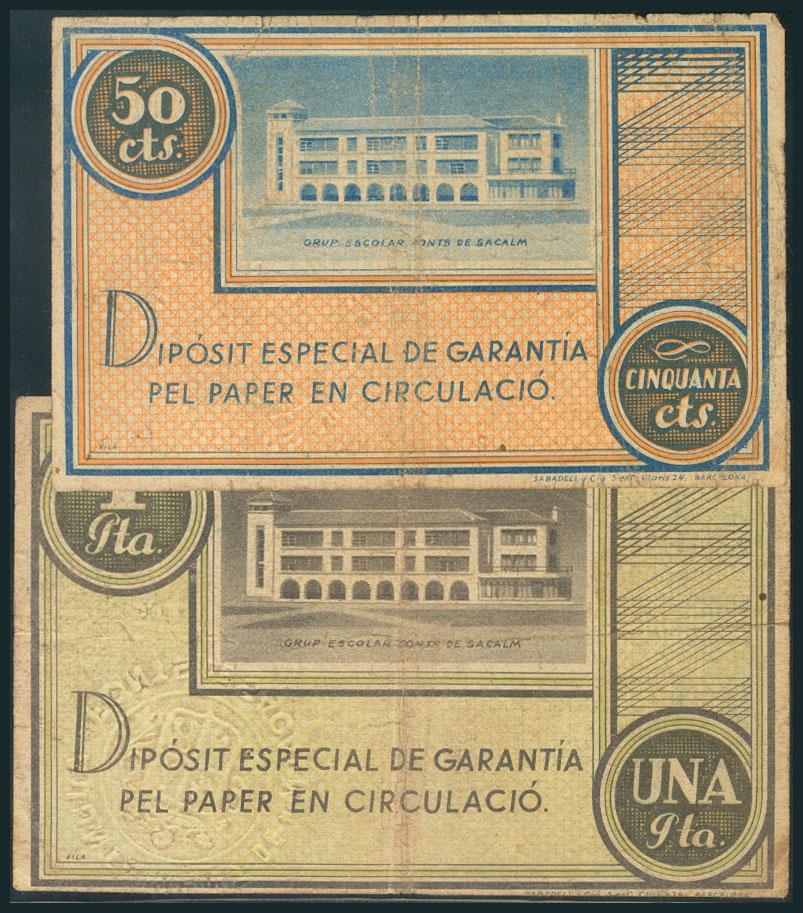 FONTS DE SACALM (GERONA). 50 Céntimos y 1 Peseta. 12 de Mayo de 1937. (González: 7913, 7914). BC.