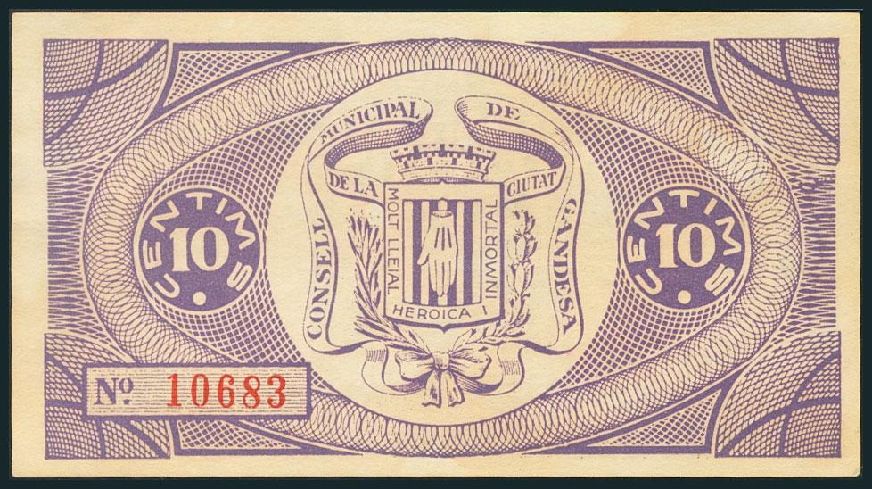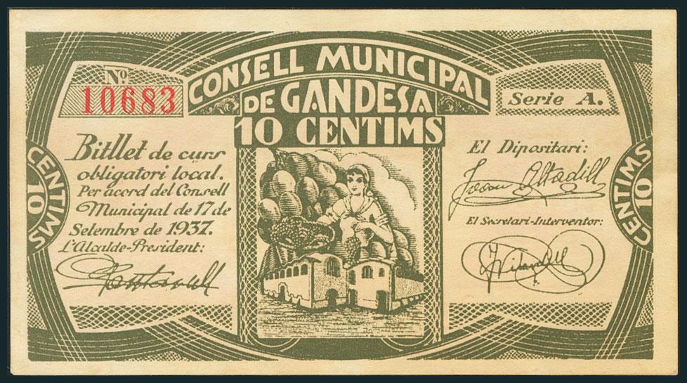 GANDESA (TARRAGONA). 10 Céntimos. 17 de Septiembre de 1937. Serie A. (González: 7961). EBC+.