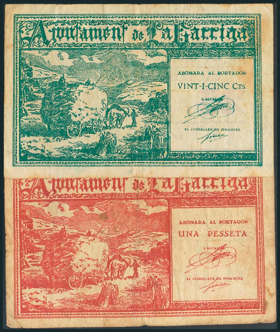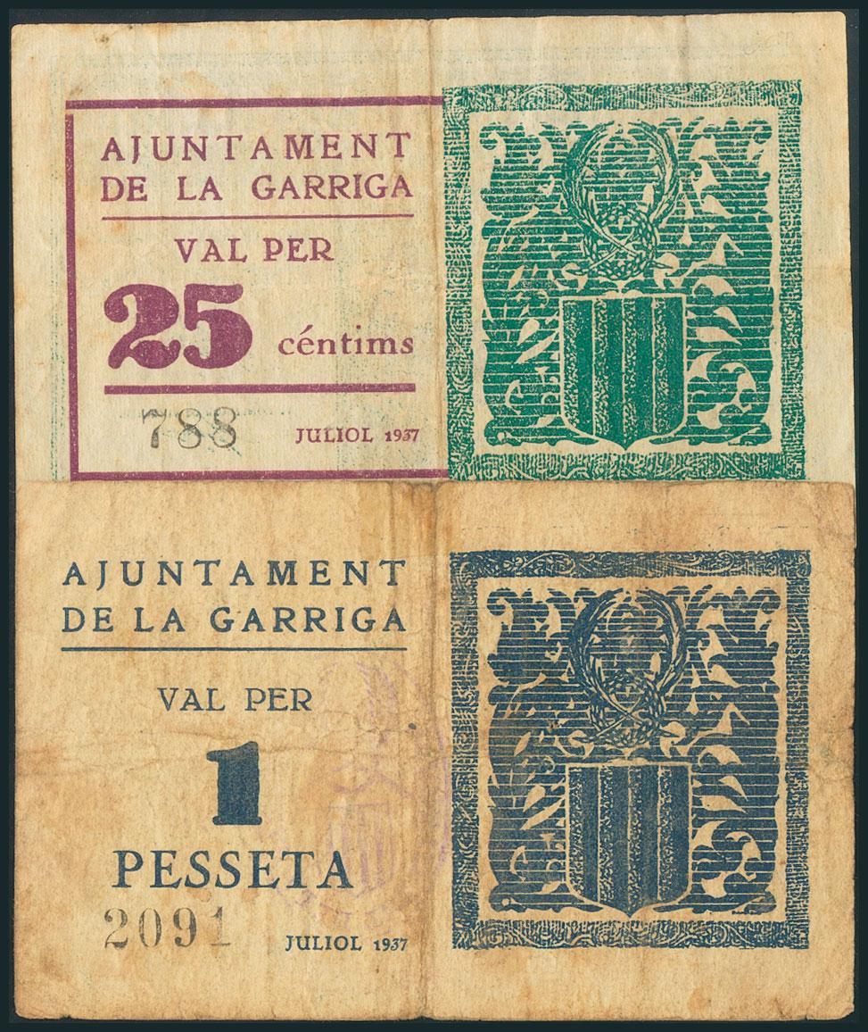 LA GARRIGA (BARCELONA). 25 Céntimos y 1 Peseta. Julio 1937. (González: 7986, 7988). BC.