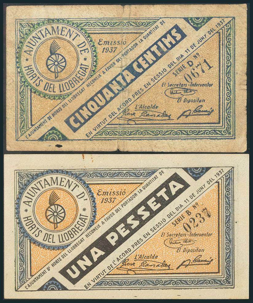 HORTS DEL LLOBREGAT (BARCELONA). 50 Céntimos y 1 Peseta. 11 de Julio de 1937. Series D y B, respectivamente. (González: 8203/04). EBC+/RC.