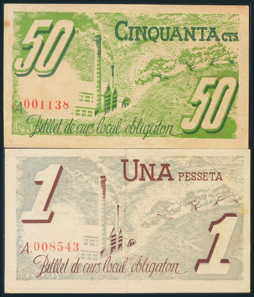 JUST DESVERN (BARCELONA). 50 Céntimos y 1 Peseta. Mayo 1937. Serie A, ambos. (González: 8300/01). EBC/MBC.