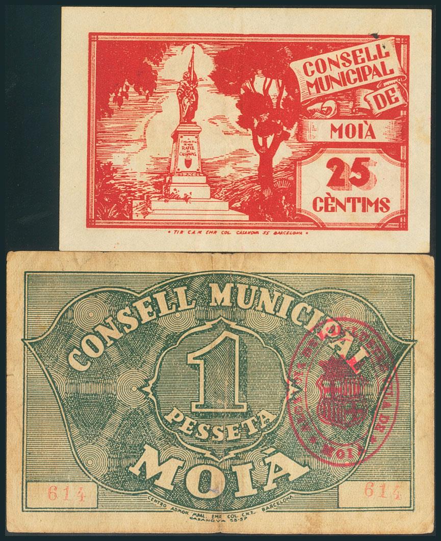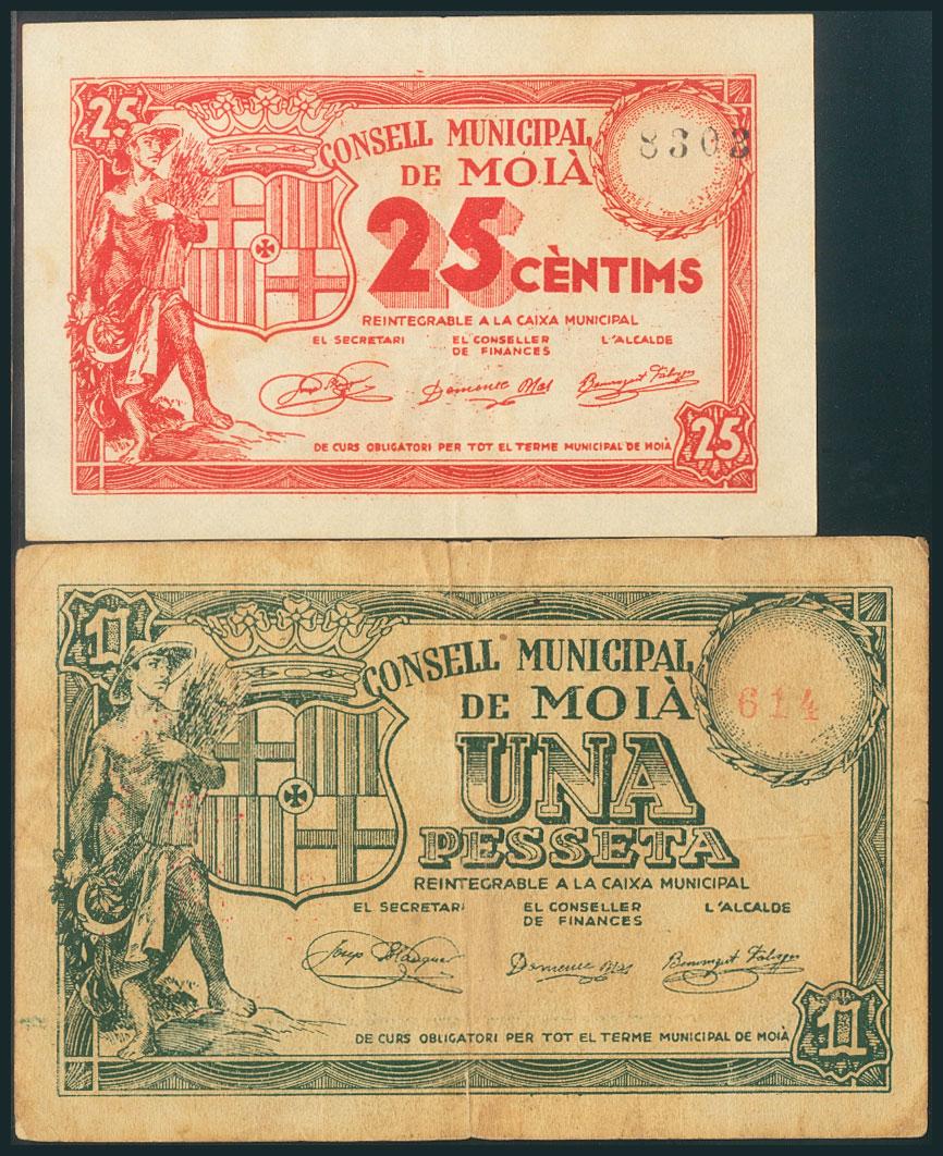 MOIA (BARCELONA). 25 Céntimos y 1 Peseta. (1938ca). (González: 8689/90). EBC/MBC.