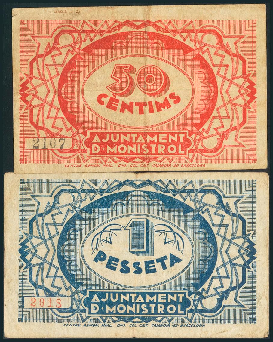 MONISTROL DE MONTSERRAT (BARCELONA). 50 Céntimos y 1 Peseta. 27 de Mayo de 1937. (González: 8726, 8727). MBC.