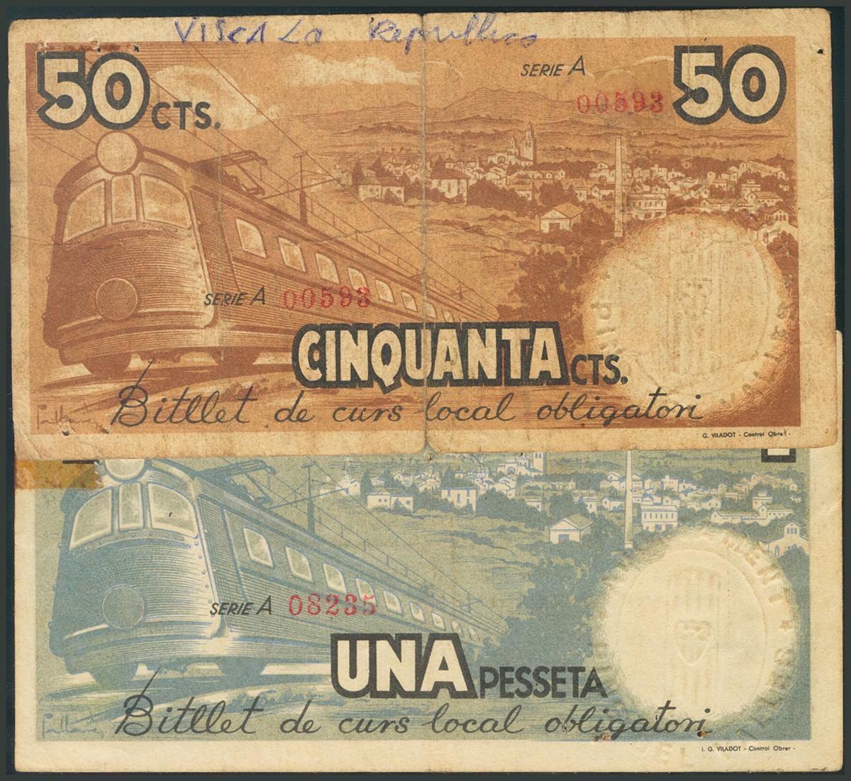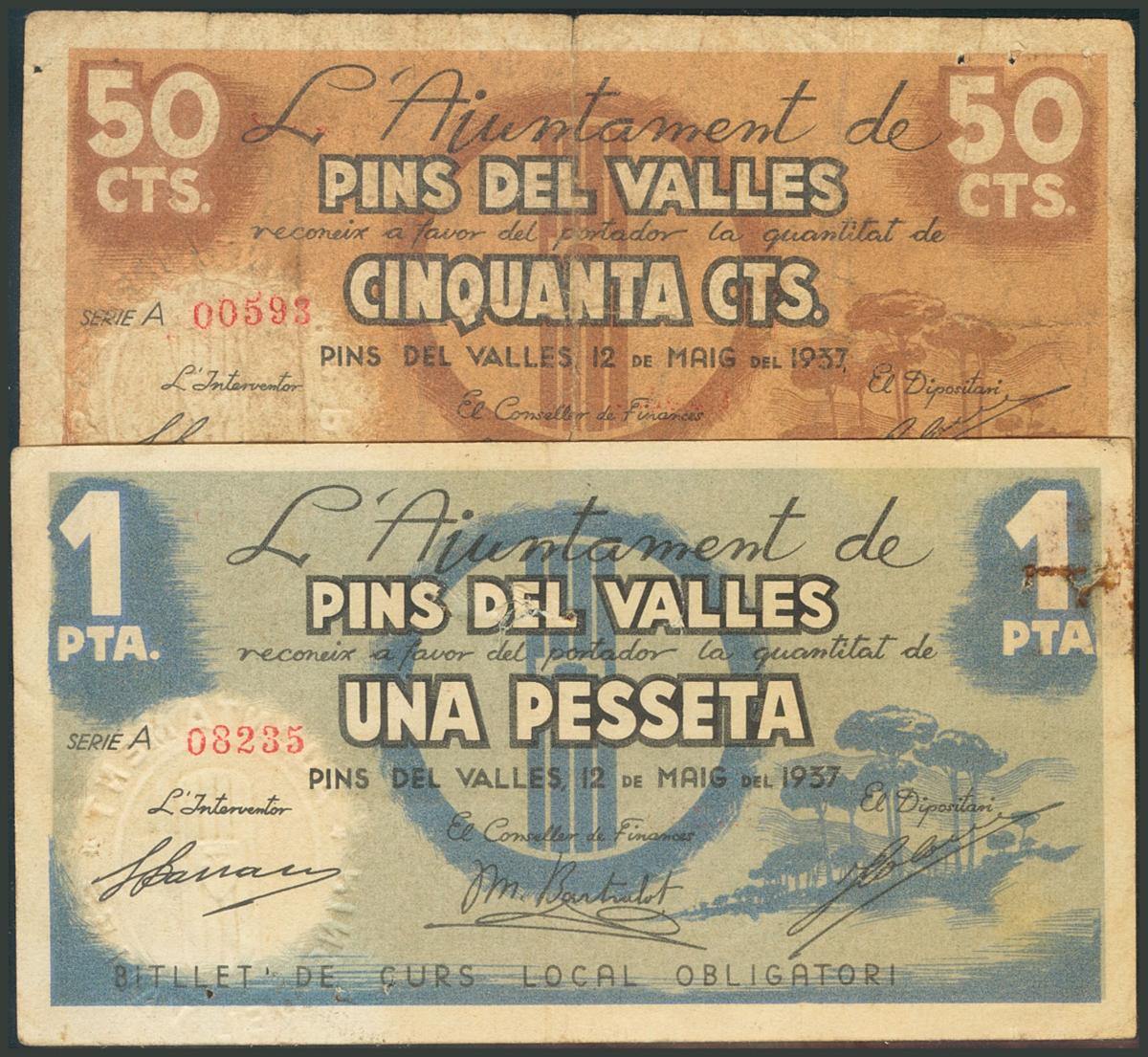 PINS DEL VALLES (BARCELONA). 50 Céntimos y 1 Peseta. 12 de Mayo de 1937. Serie A. (González: 9244/45). BC.