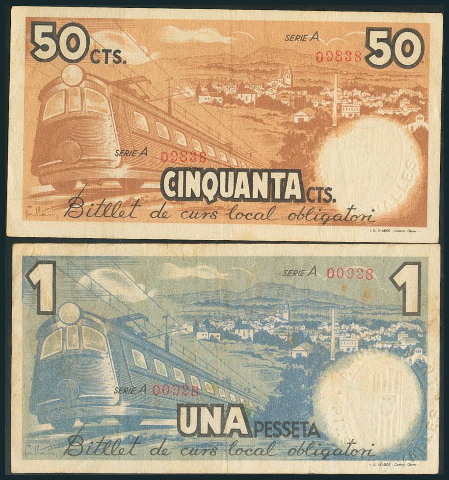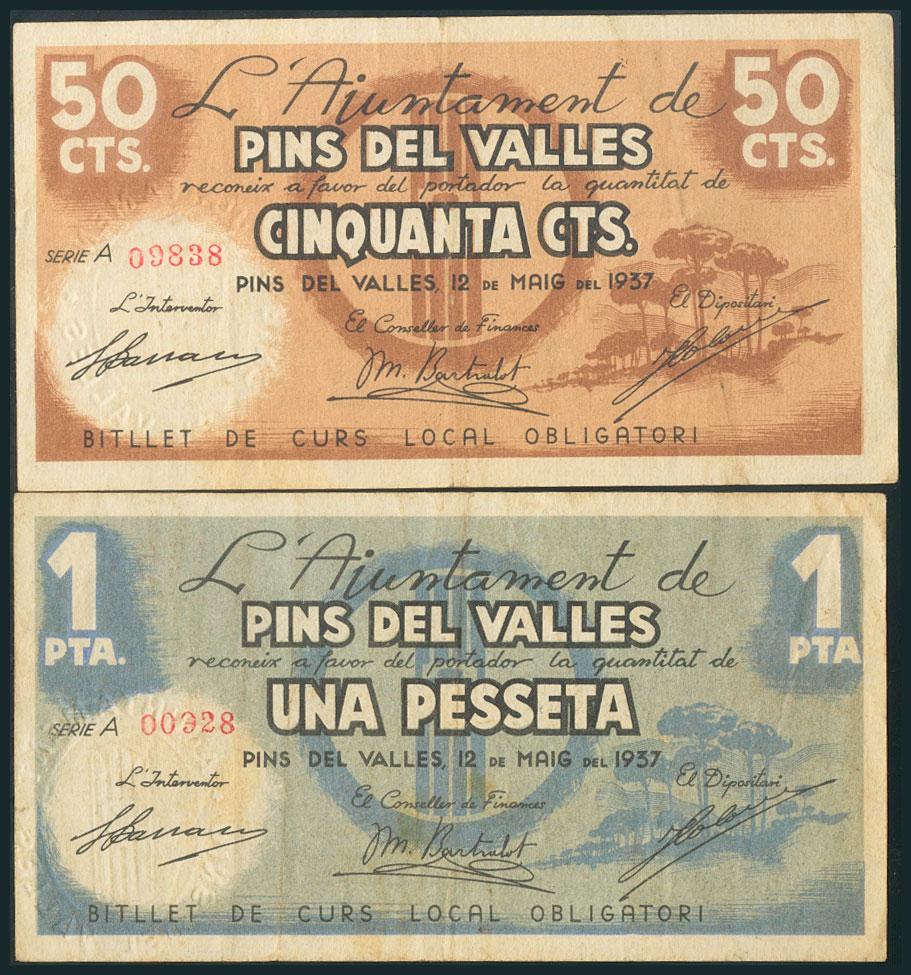 PINS DEL VALLES (BARCELONA). 50 Céntimos y 1 Peseta. 12 de Mayo de 1937. Serie A, ambos. (González: 9244/45). MBC.