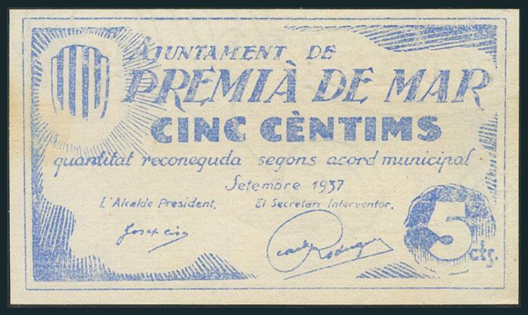 PREMIA DE MAR (BARCELONA). 5 Céntimos. Septiembre 1937. (González: 9467). EBC.