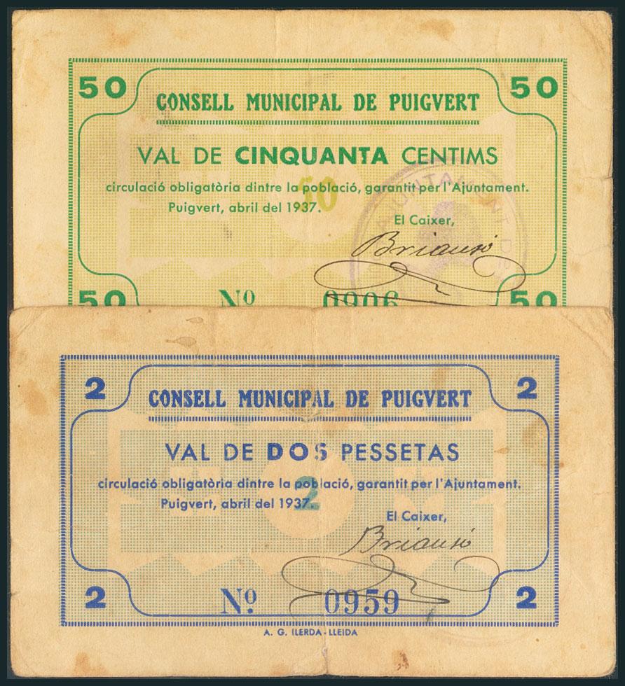 PUIGVERT (LERIDA). 50 Céntimos y 2 Pesetas. Abril 1937. (González: 9513/15). Rarísimos. MBC.