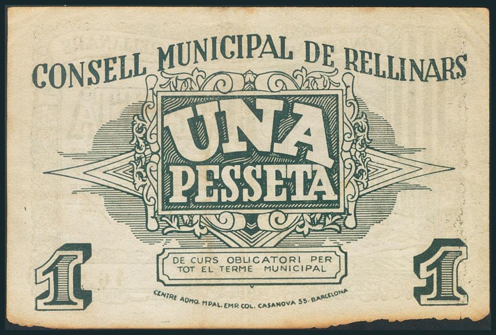 RELLINARS (BARCELONA). 1 Peseta. 1 de Septiembre de 1937. (González: 9546). Muy raro. MBC.