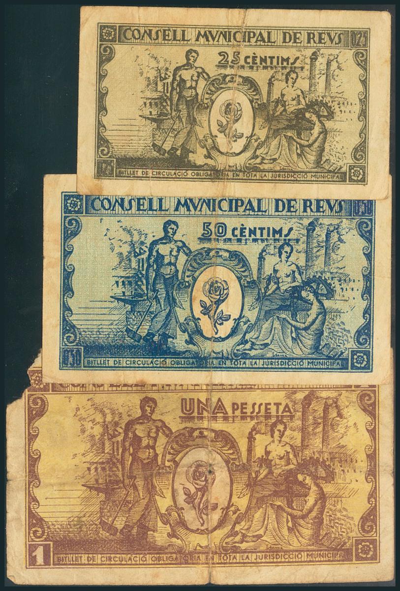 REUS (TARRAGONA). 25 Céntimos, 50 Céntimos y 1 Peseta. 14 de Mayo de 1937. Serie C el de 25 cts y A, los otros dos. (González: 9550, 9554, 9560). BC/RC.