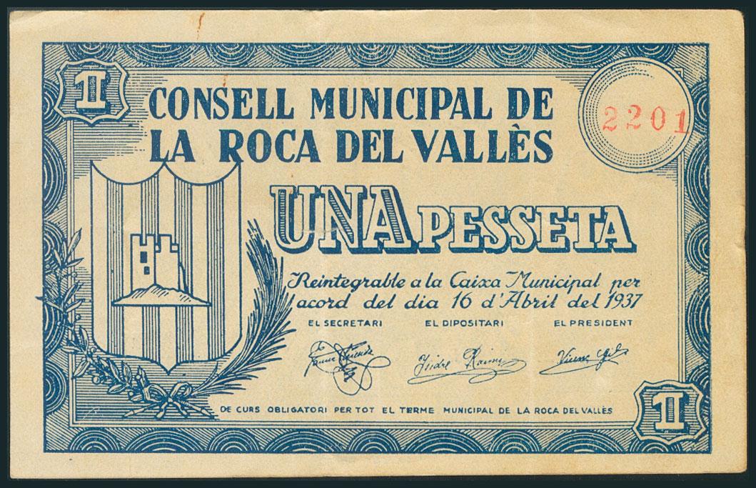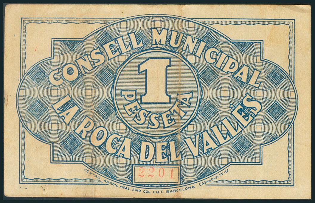 ROCA DEL VALLES (BARCELONA). 1 Peseta. 16 de Mayo de 1937. Sin sello estampado. (González: 9702). MBC.