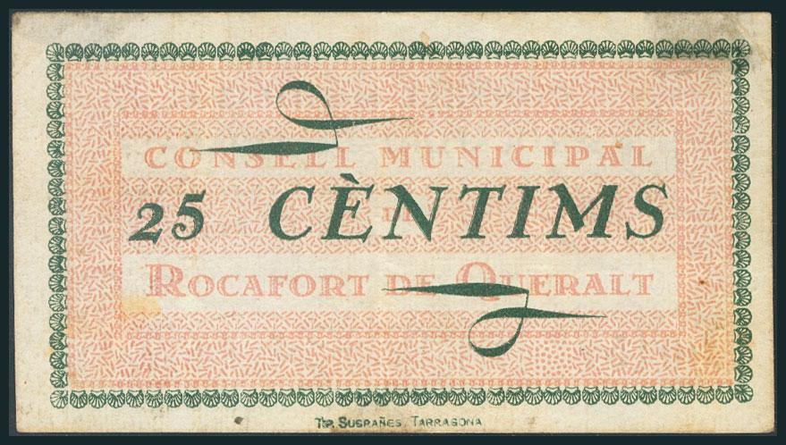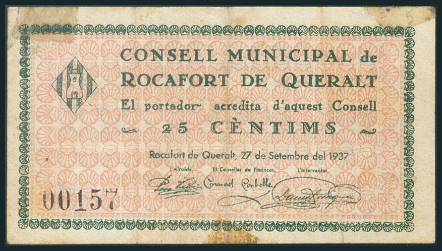 ROCAFORT DE QUERALT (TARRAGONA). 25 Céntimos. 27 de Septiembre de 1937. (González: 9705). MBC.