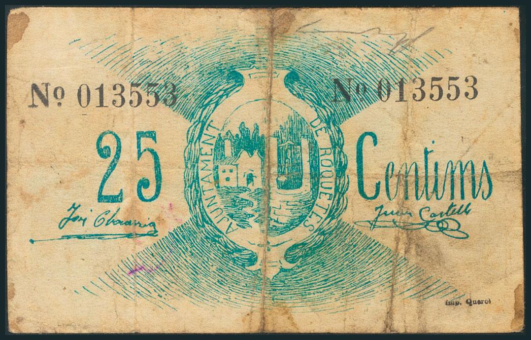 ROQUETES (TARRAGONA). 25 Céntimos. (1938ca). (González: 9735). BC.