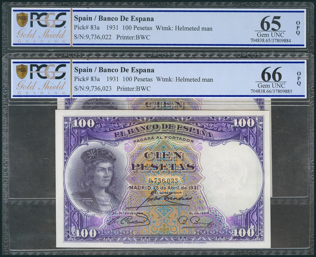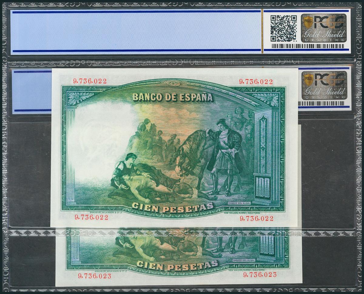 100 Pesetas. 25 de Abril de 1931. Pareja correlativa. Sin serie. (Edifil 2017: 360). Encapsulados PCGS65OPQ/66OPQ. SC.