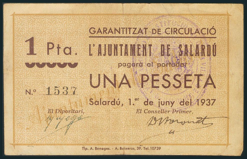 SALARDU (LERIDA). 1 Peseta. 1 de Junio de 1937. (González: 9813). Muy raro. MBC.