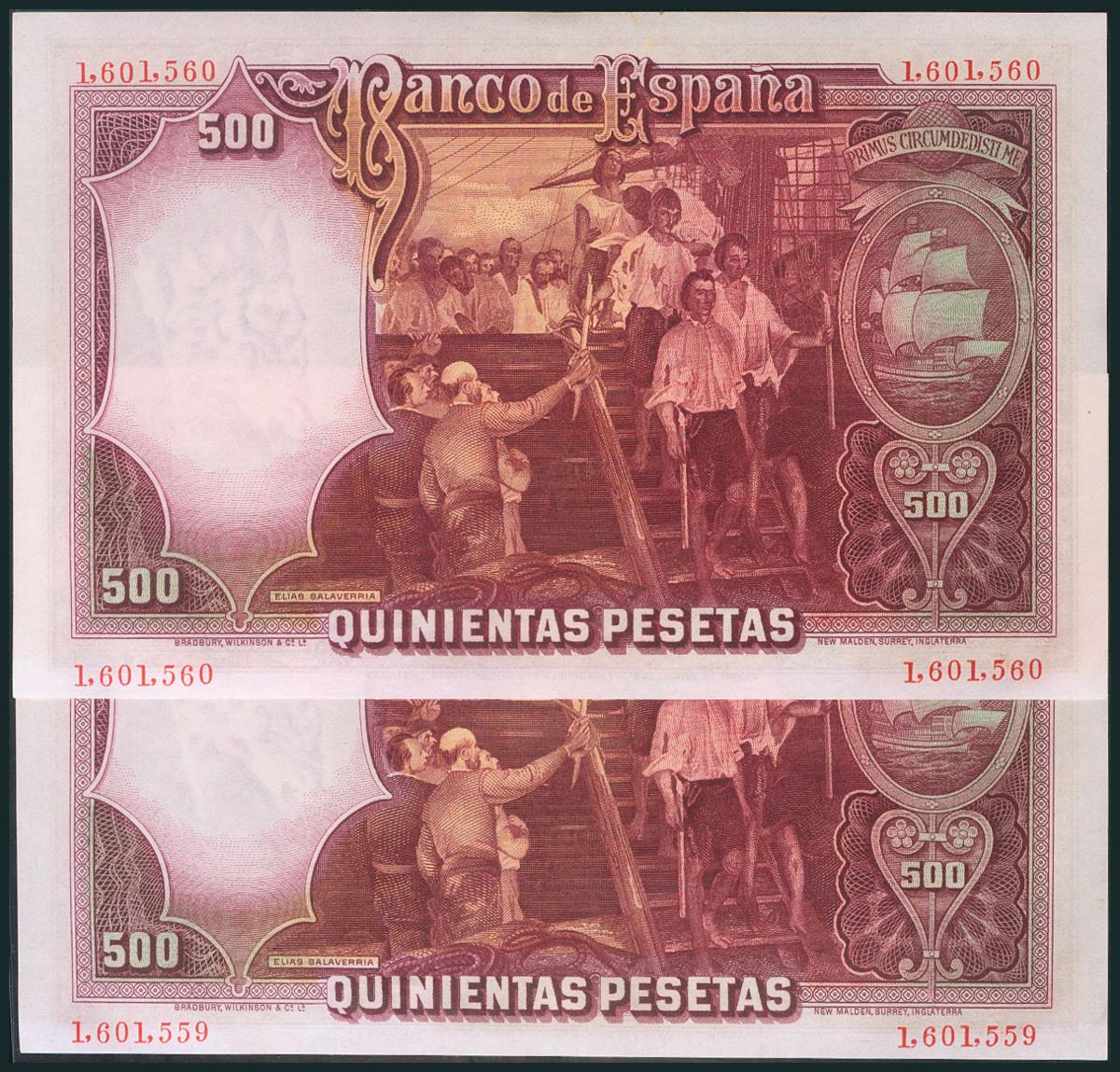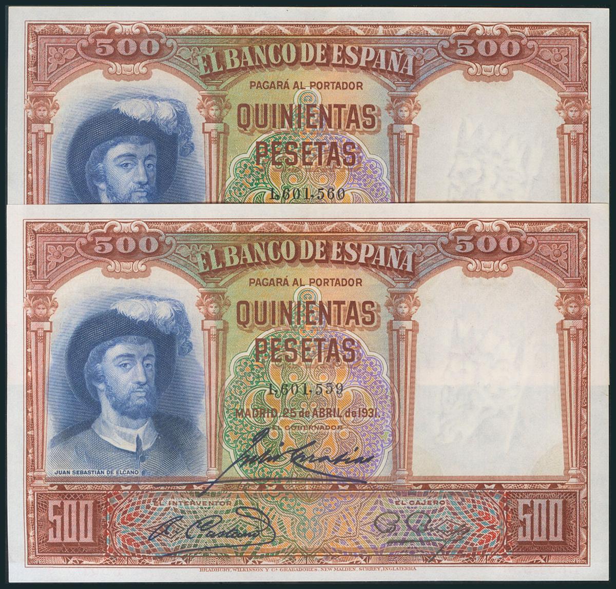 500 Pesetas. 25 de Abril de 1931. Pareja correlativa. Sin serie. (Edifil 2017: 361). Apresto original. SC.