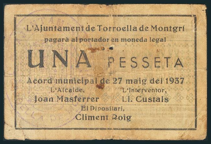 TORROELLA DE MONTGRI (GERONA). 1 Peseta. 27 de Mayo de 1937. (González: 10393). RC.