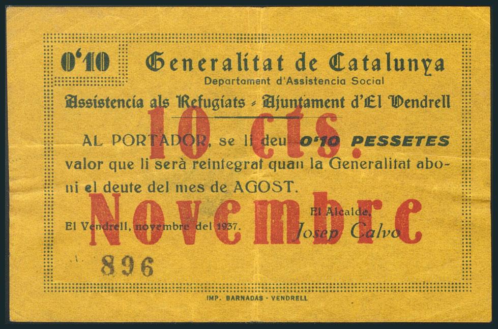 VENDRELL (TARRAGONA). 10 Céntimos. Noviembre 1937. (González: 10605). Rarísimo. MBC+.