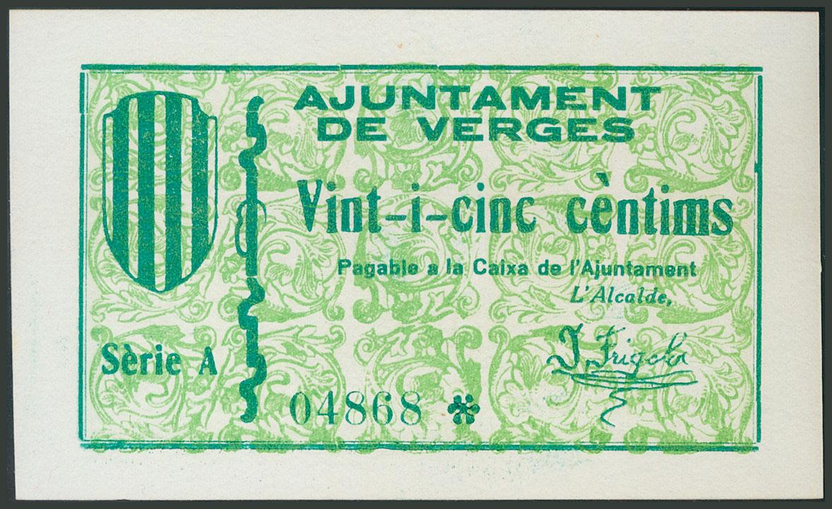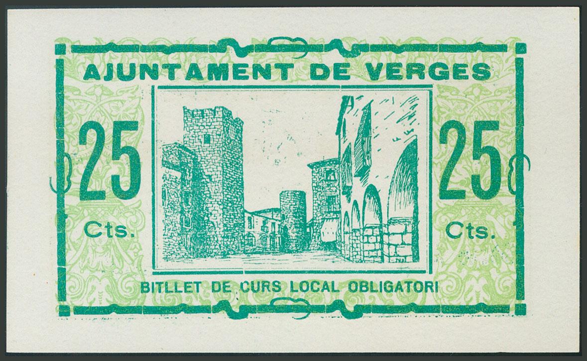 VERGES (GERONA). 25 Céntimos. (1938ca). Serie A. (González: 10624). SC.