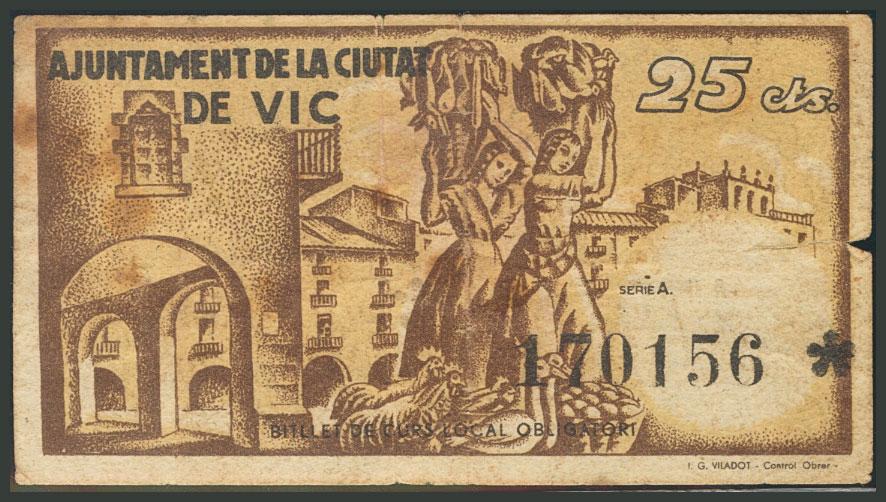 VIC (BARCELONA). 25 Céntimos. 7 de Junio de 1937. Serie A. (González: 10629). MBC.