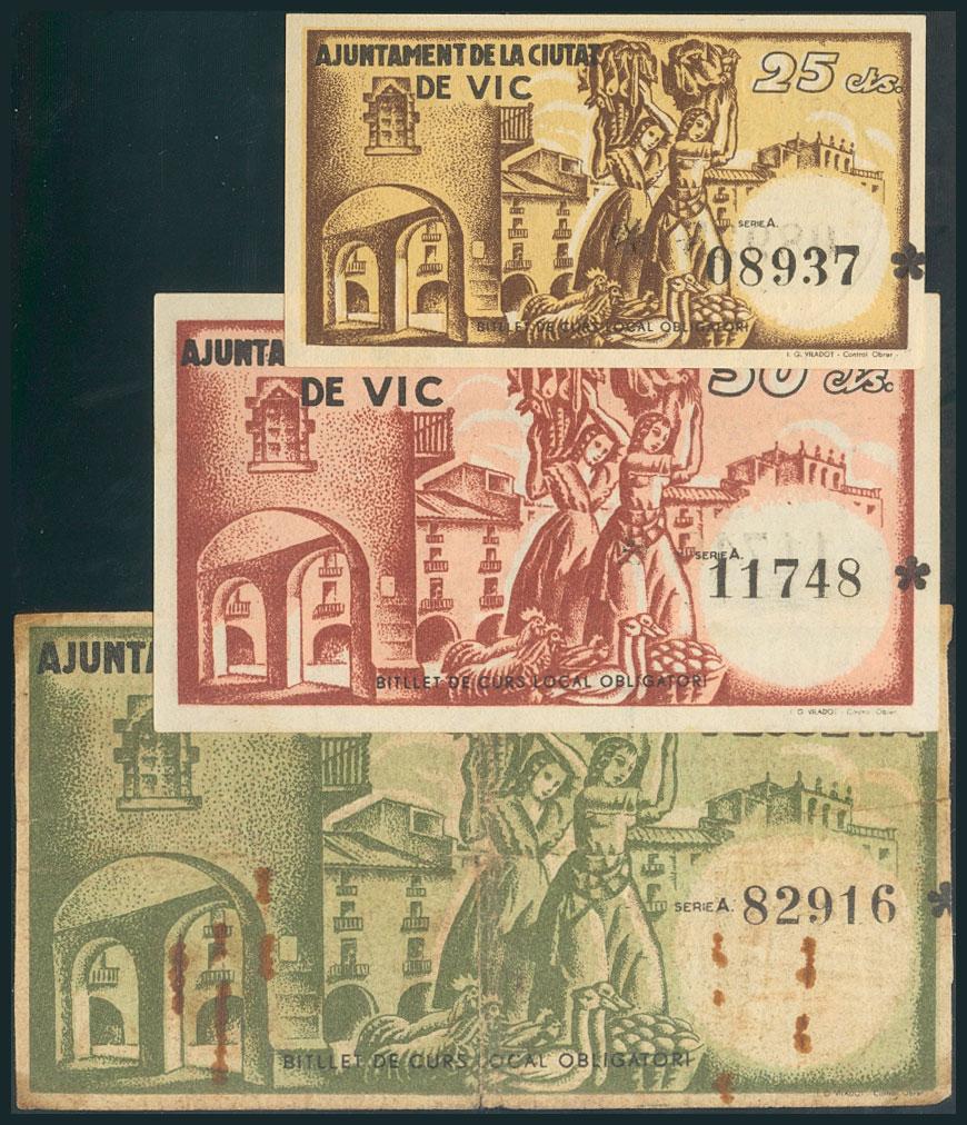 VIC (BARCELONA). 25 Céntimos, 50 Céntimos y 1 Peseta. 7 de Junio de 1937. Serie A. (González: 10629/31). SC/BC.