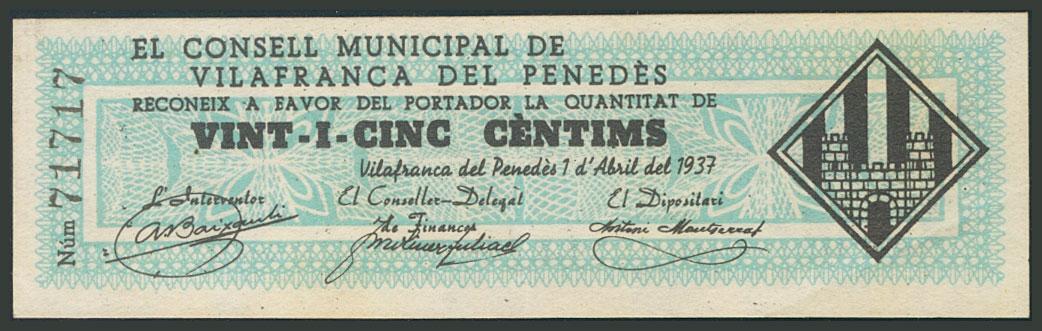 VILAFRANCA DEL PENEDES (BARCELONA). 25 Céntimos. 1 de Abril de 1937. (González: 10708). EBC.