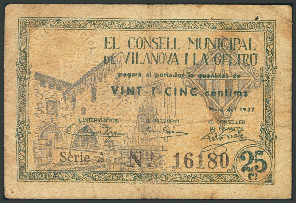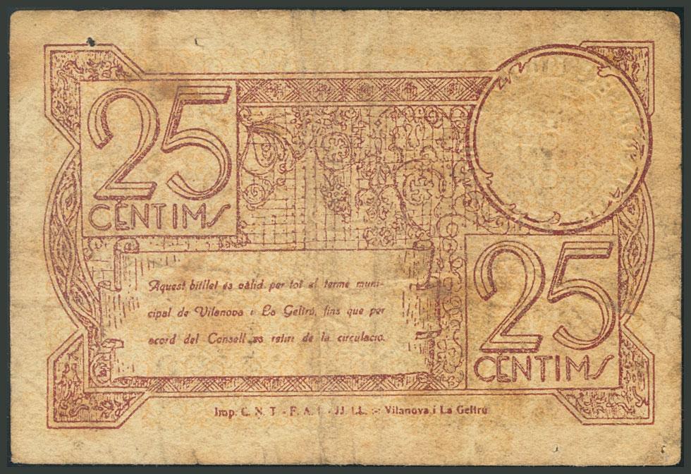 VILANOVA I LA GELTRU (BARCELONA). 25 Céntimos. Mayo 1937. Serie A. (González: 10832). BC.