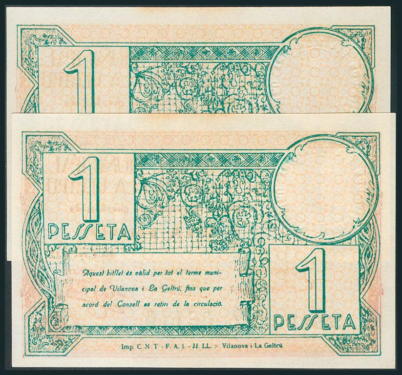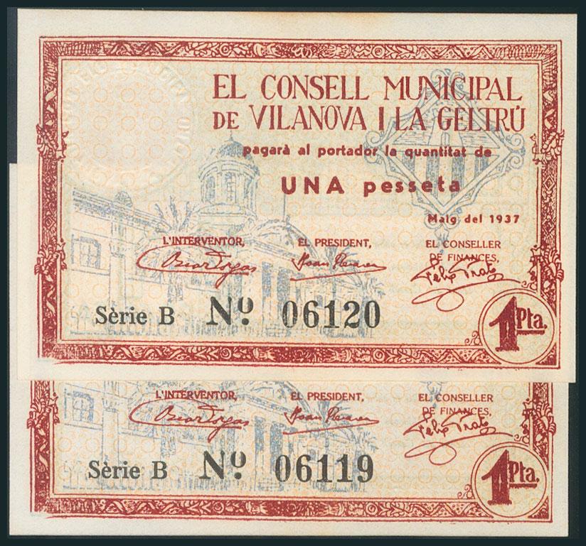 VILANOVA Y LA GELTRU (BARCELONA). 1 Peseta. Mayo 1937. Pareja correlativa. Sello en seco. (González: 10834). SC.