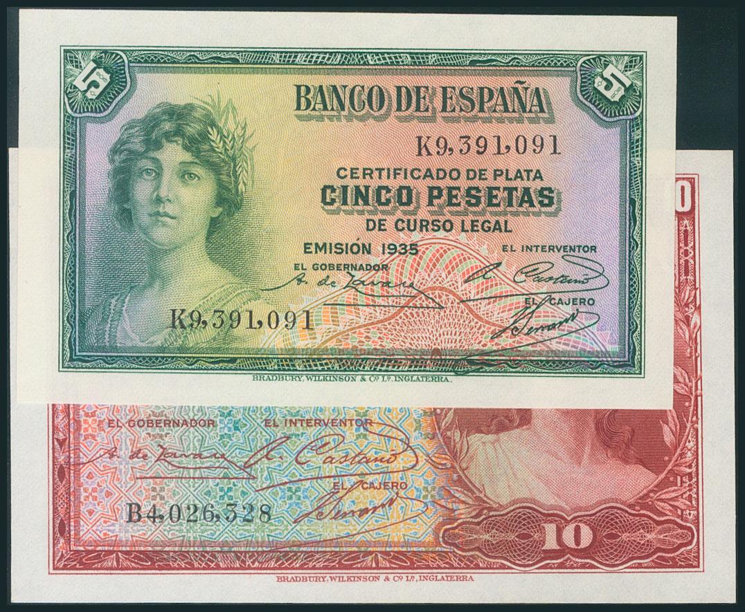 Conjunto de 2 billetes de 5 Pesetas y 10 Pesetas, emitidos en 1935 con las series K y B, respectivamente (Edifil 2017: 363b, 364a). Apresto original. SC.