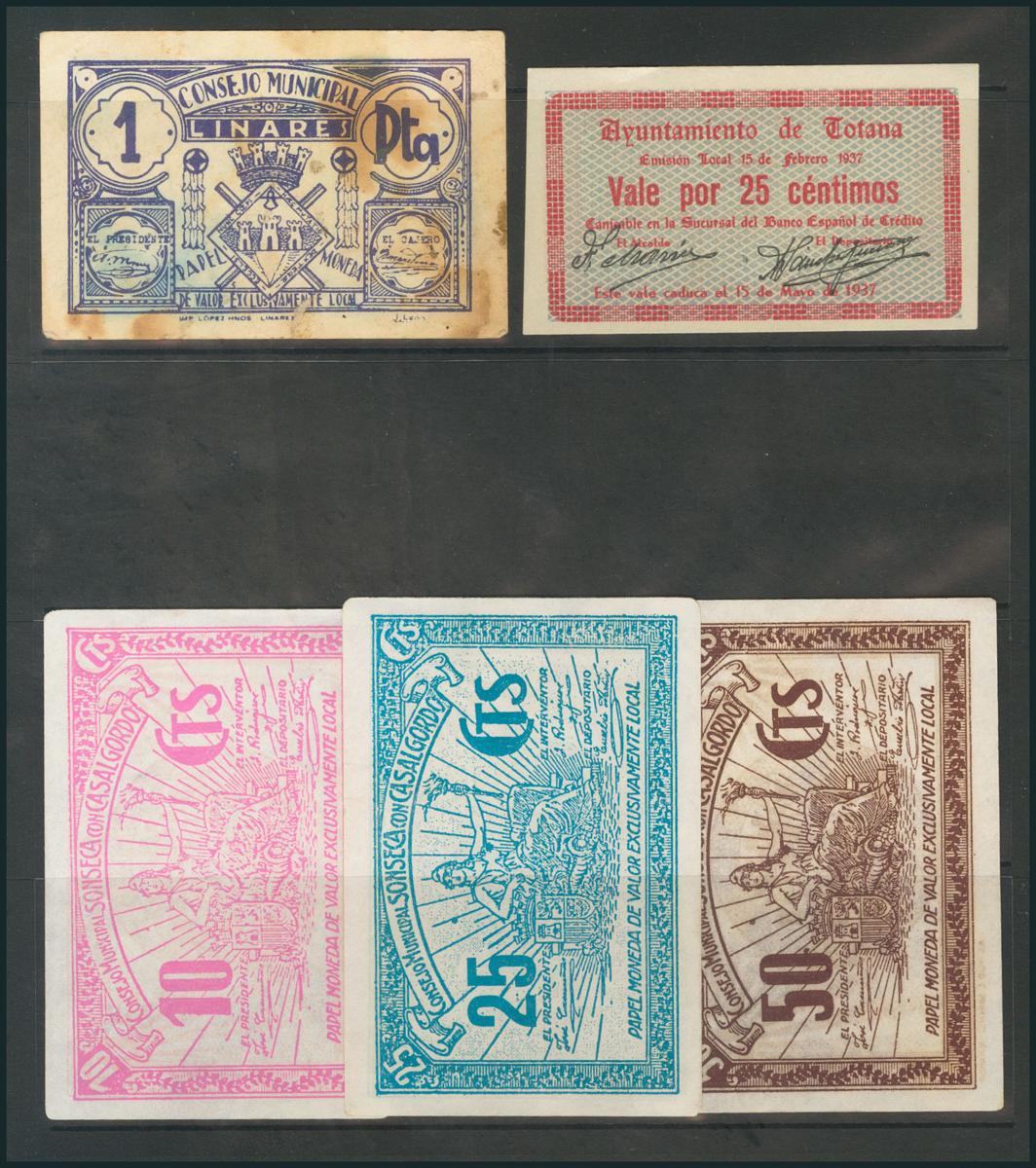 Conjunto de 5 billetes de la Guerra Civil, de Linares (Jaén), Totana (Murcia) y de Casalgordo (3) de Albacete. A EXAMINAR.