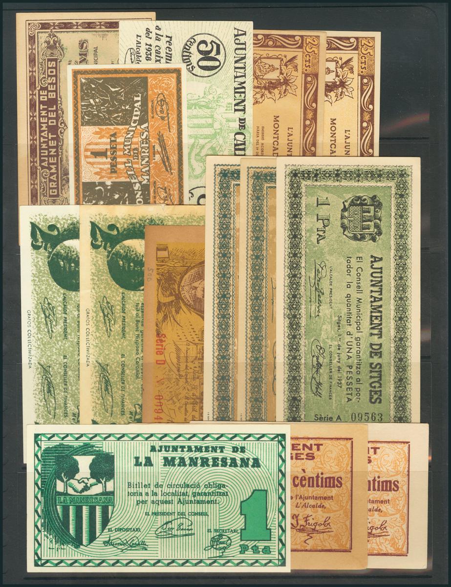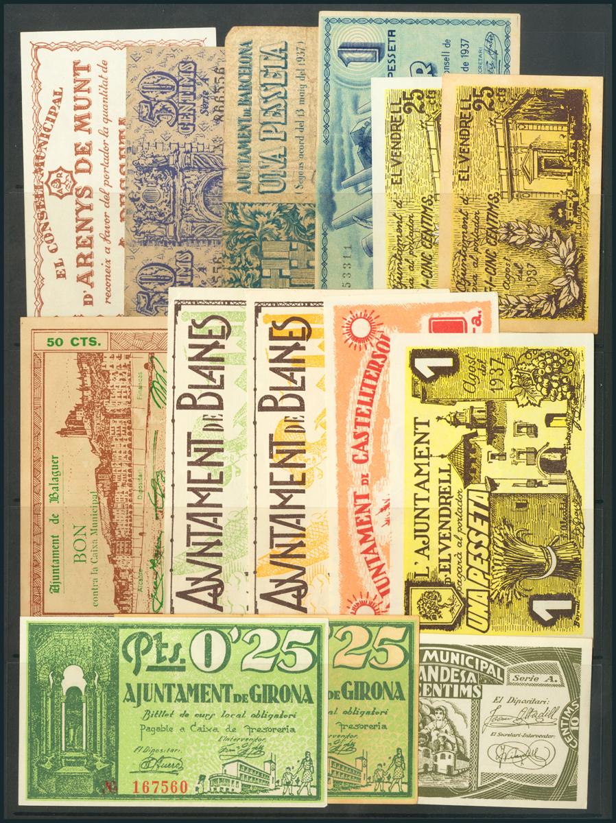 Curioso conjunto de 28 billetes de la Guerra Civil, todos ellos de poblaciones catalanas, alguno repetido y en general buenas conservaciones. A examinar.