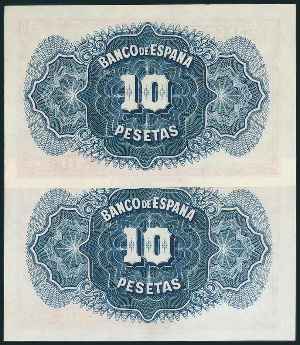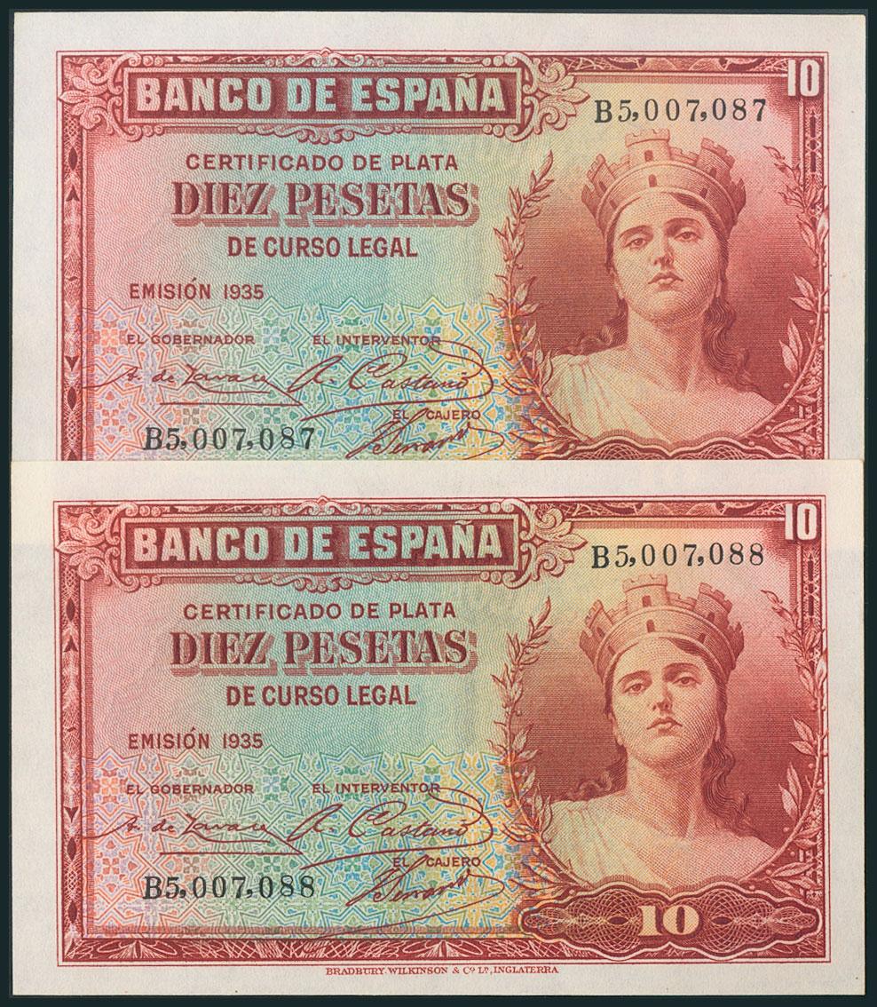 10 Pesetas. 1935. Pareja correlativa. Serie B. (Edifil 2017: 364a). SC.