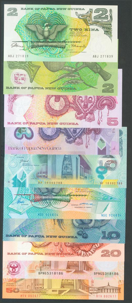 PAPUA NEW GUINEA. Conjunto de 10 billetes de Papua New Guinea de 2 Kinas, 5 Kinas, 10 Kinas, 20 Kinas y 50 Kinas. A EXAMINAR. SC/SC-.