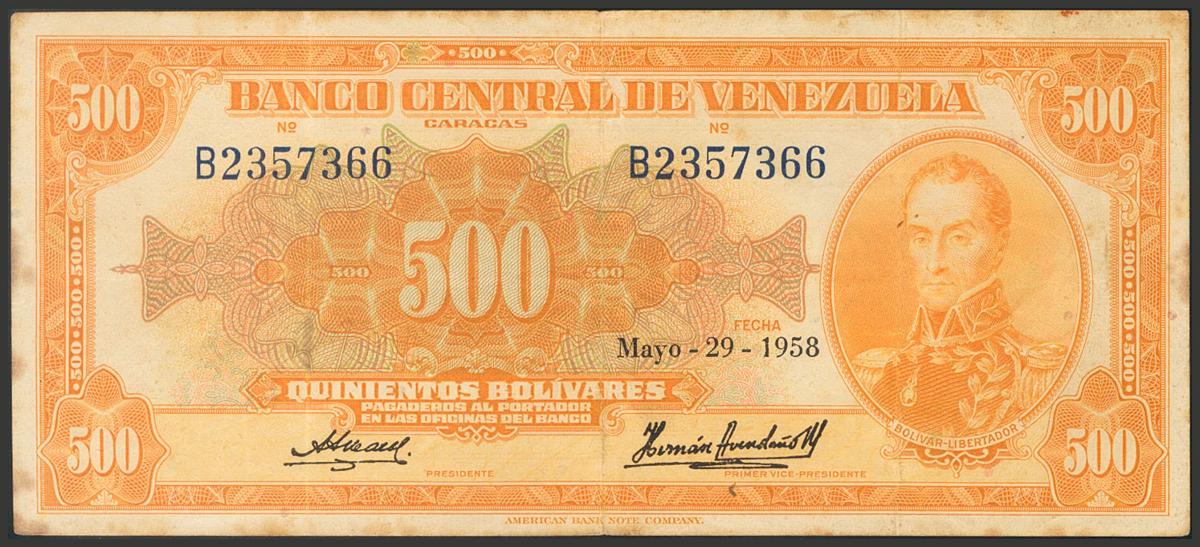 VENEZUELA. 500 Bolívares. 29 de Mayo de 1958. Firmado por Aurelio Arreza y Enrique Salas. Serie B. (Pick: 37b, Sleiman: 27). MBC.