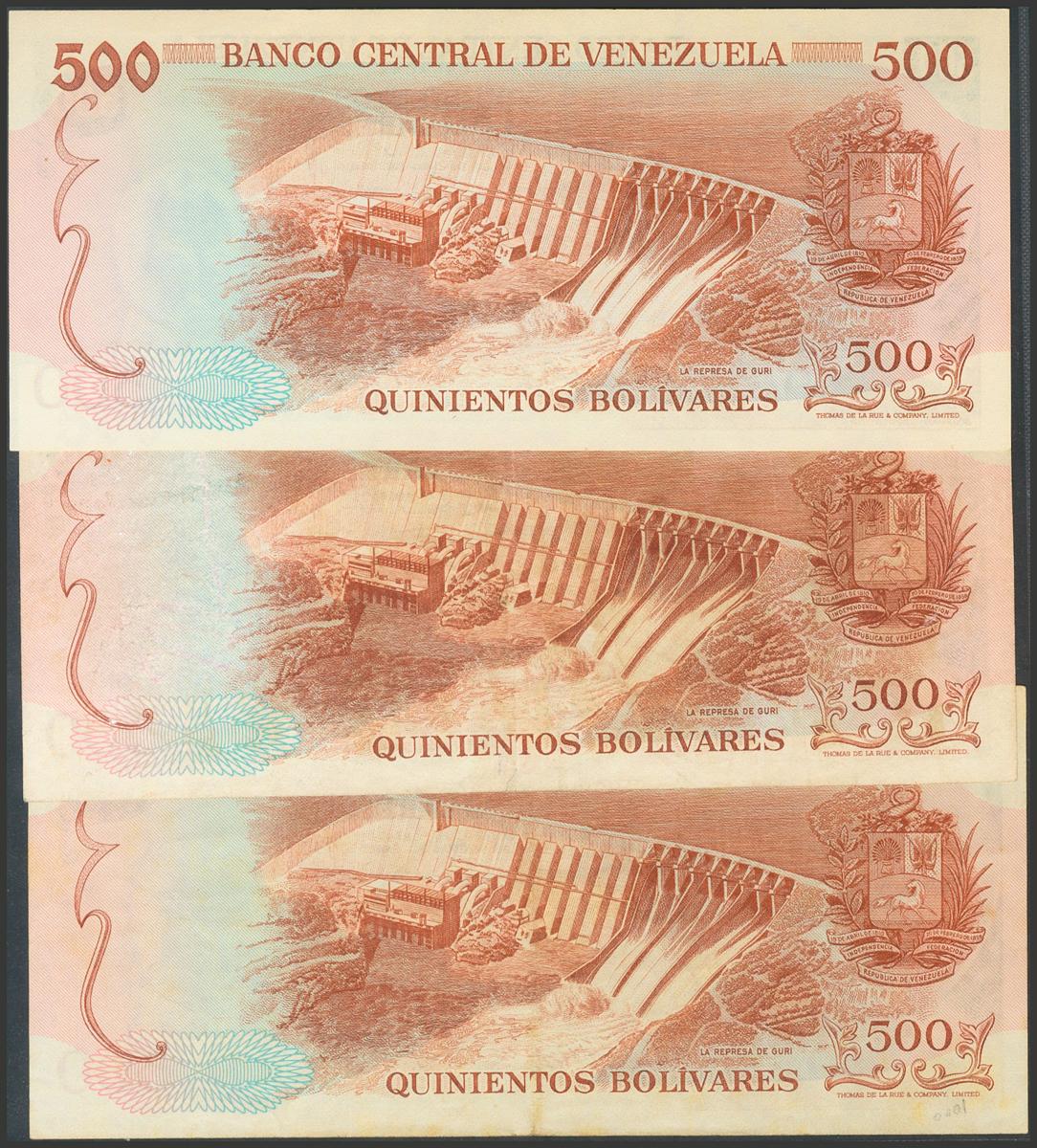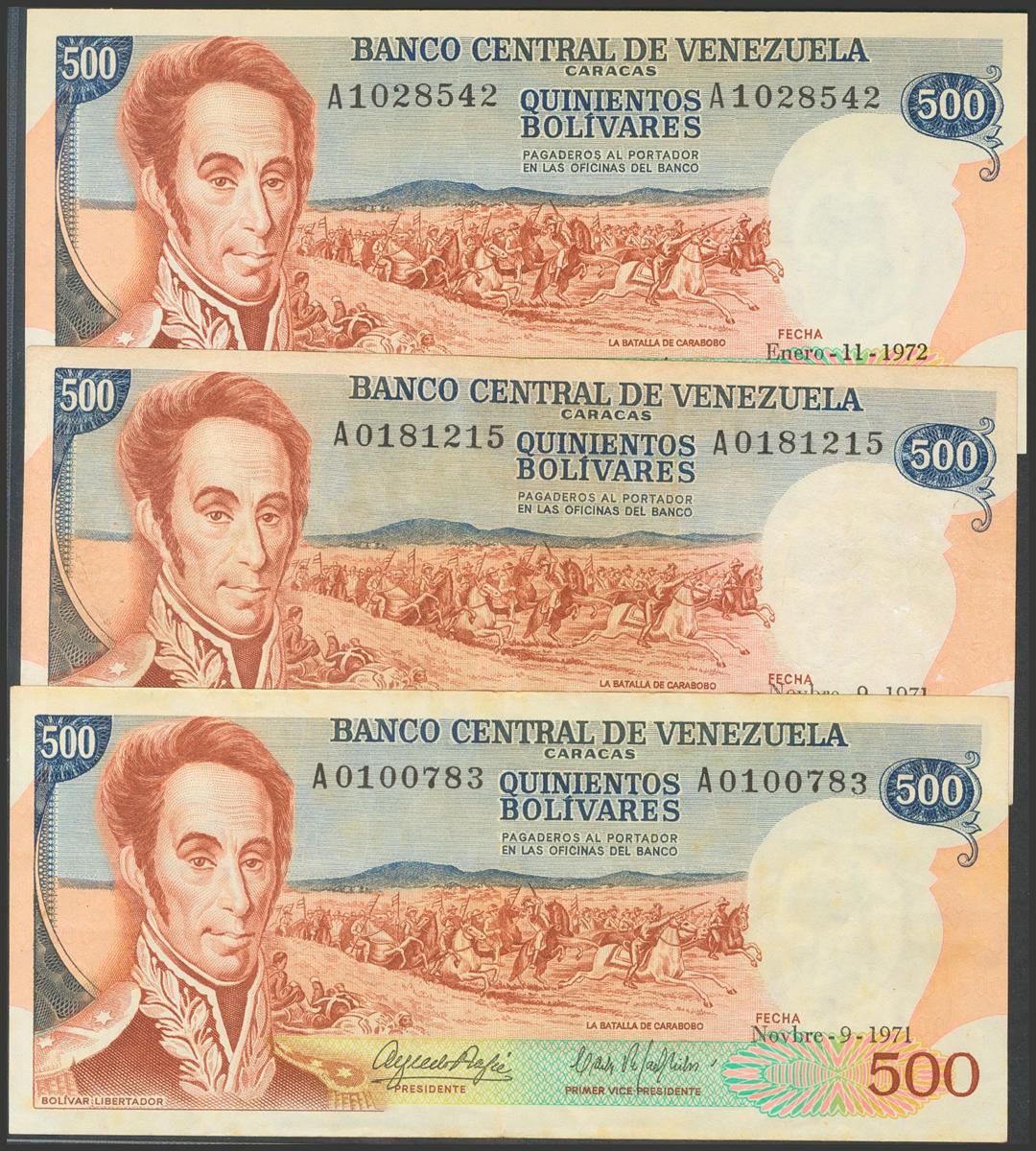VENEZUELA. Conjunto de 3 billetes de 500 Bolívares emitidos el 9 de Noviembre de 1971 (2 x MBC) y 11 de Enero de 1972 (1 x SC), todos ellos con serie A.