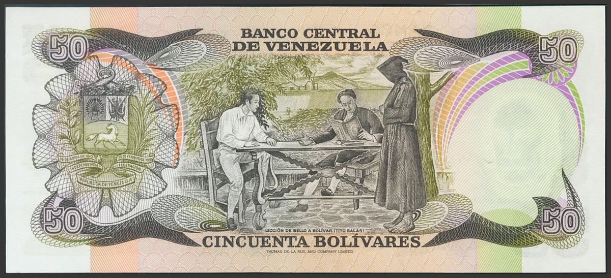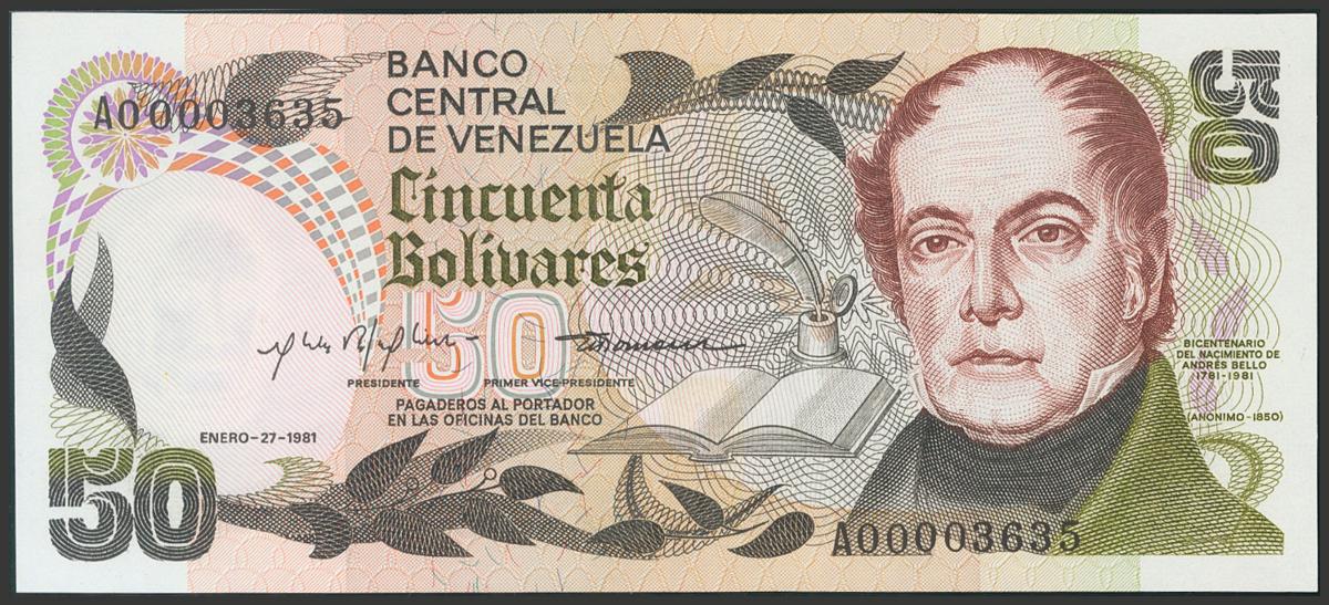 VENEZUELA. 50 Bolívares. 27 de Enero de 1981. Firmado por Carlos Rafael Silva y Hugo Romero Quintero. Serie A. (Pick: 58a, Sleiman: 88). SC.
