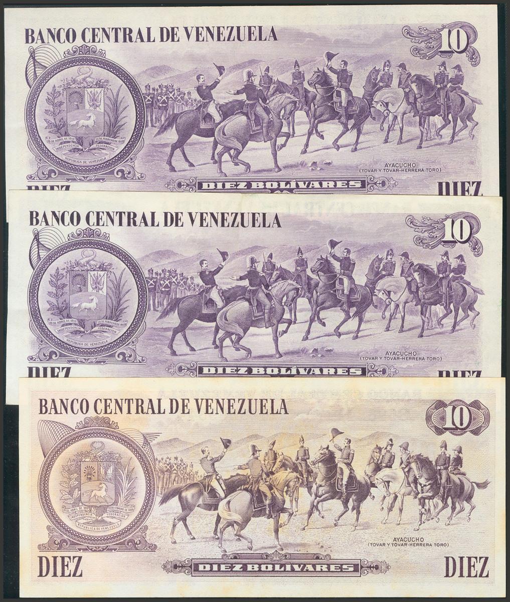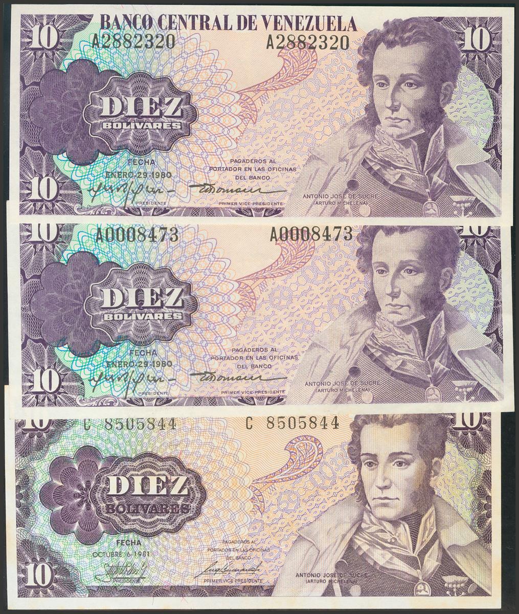 VENEZUELA. Conjunto de 3 billetes de 10 Bolívares emitidos el 29 de Enero de 1980 (2) con la serie A y 6 de Octubre de 1981 con la serie C y 7 dígitos. (Pick: 60, Sleiman: 194(2), 198). EBC.