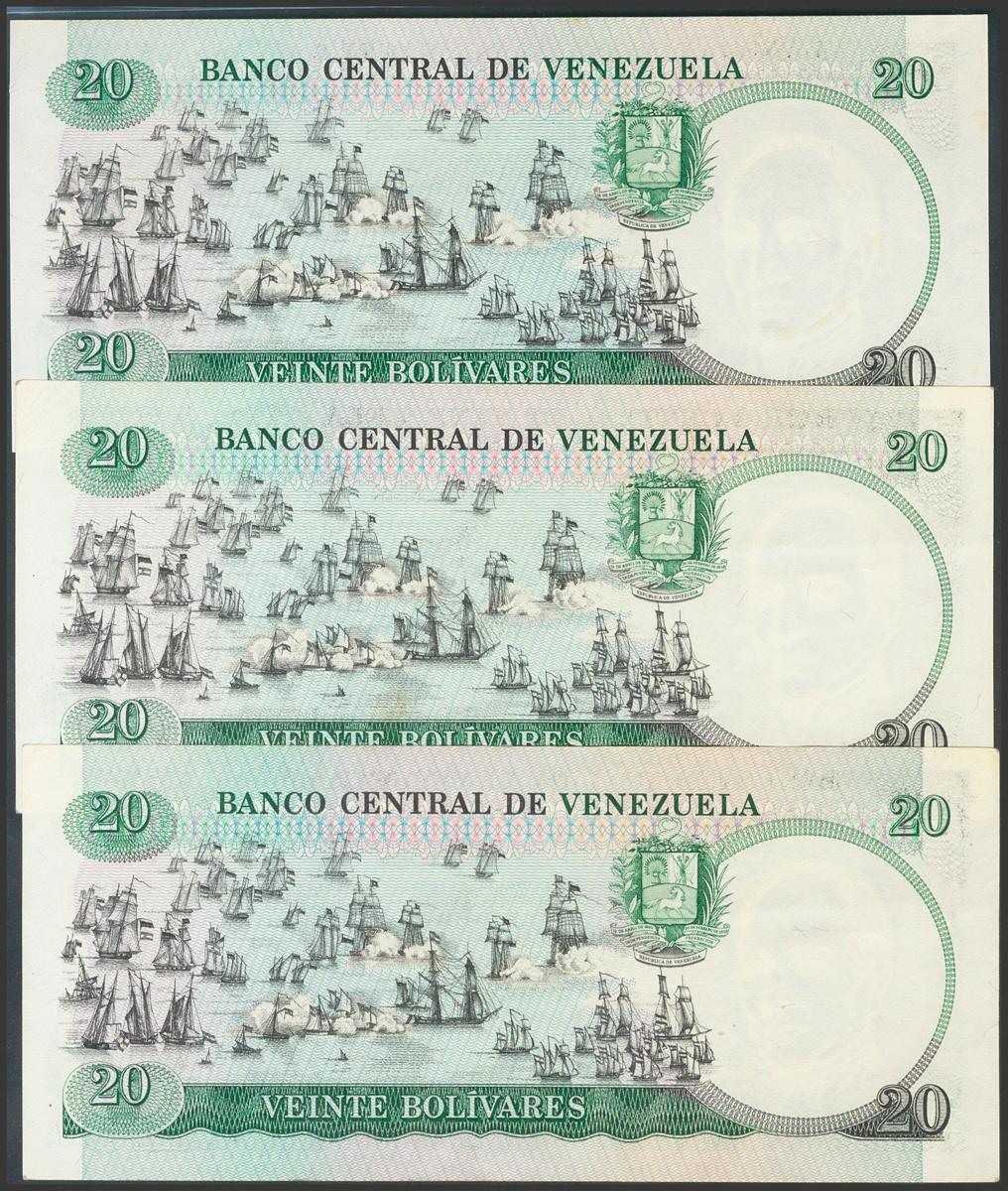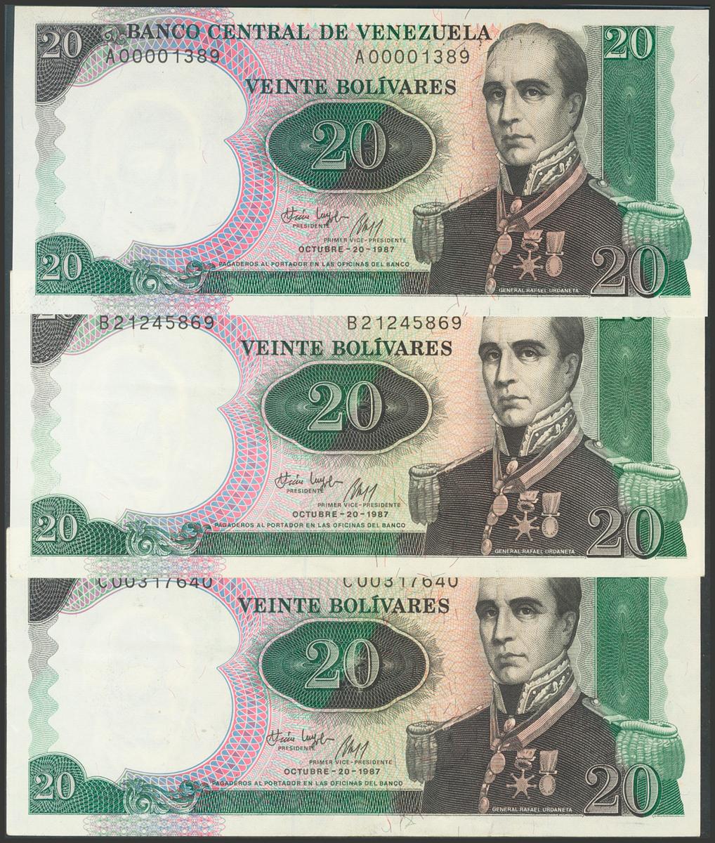 VENEZUELA. Conjunto de 3 billetes de 20 Bolívares emitidos el 20 de Octubre de 1987, con series A, B y C, respectivamente. (Pick:71, Sleiman: 182/84). EBC/SC.