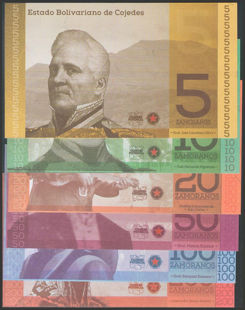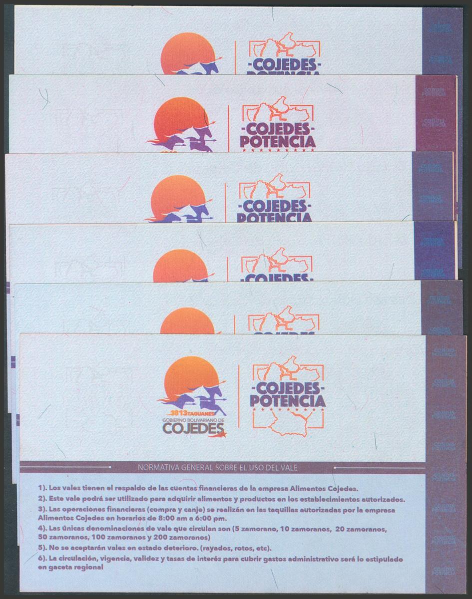 VENEZUELA. Serie completa compuesta por vales de 5, 10, 20, 50, 100 y 200 Zamoranos emitidos por el Estado Bolivariano de Cojedes, se utilizaban como vales de intercambio de alimentos, panderías, etc. En Agosto de 2018 se dejaron de vender y fueron retirados. SC.