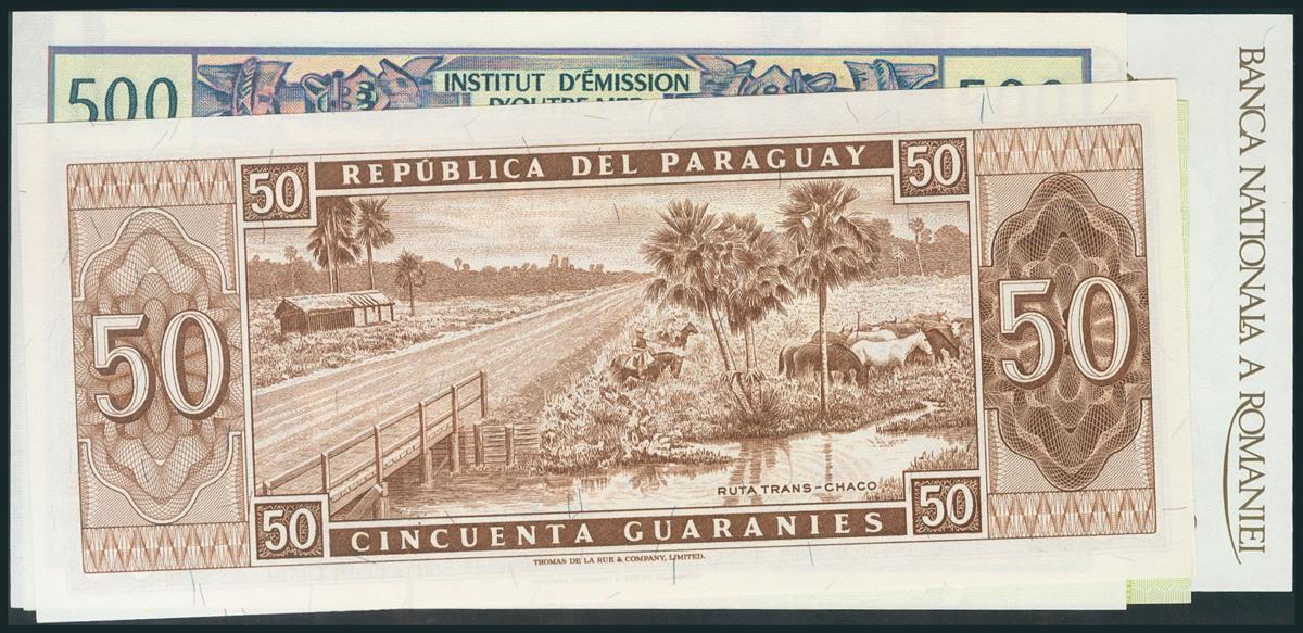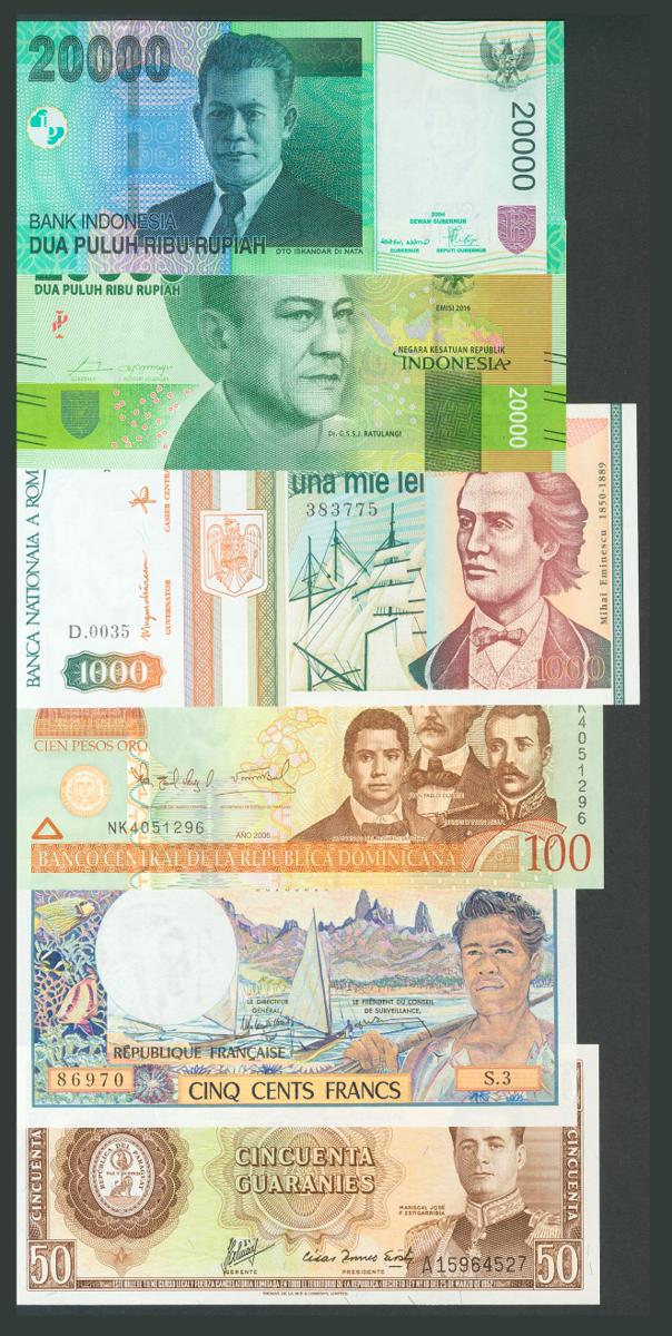 (WORLDWIDE LOTS). Conjunto de 6 billetes extranjeros de 20000 Rupiahs (2), 1000 ceu romano, 100 Pesos de oro, 500 Francos y 50 Colones. A EXAMINAR. SC/SC-.