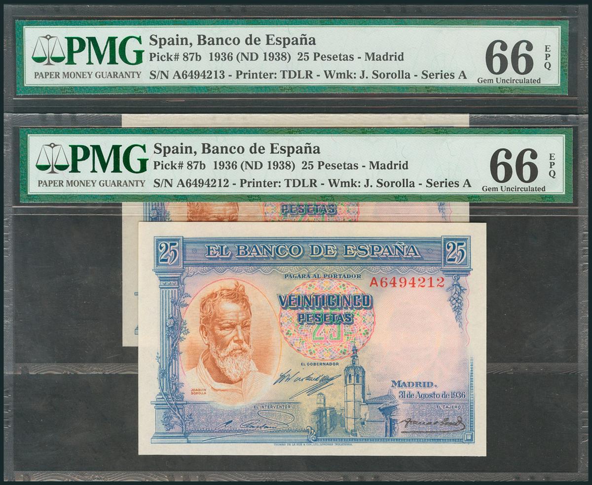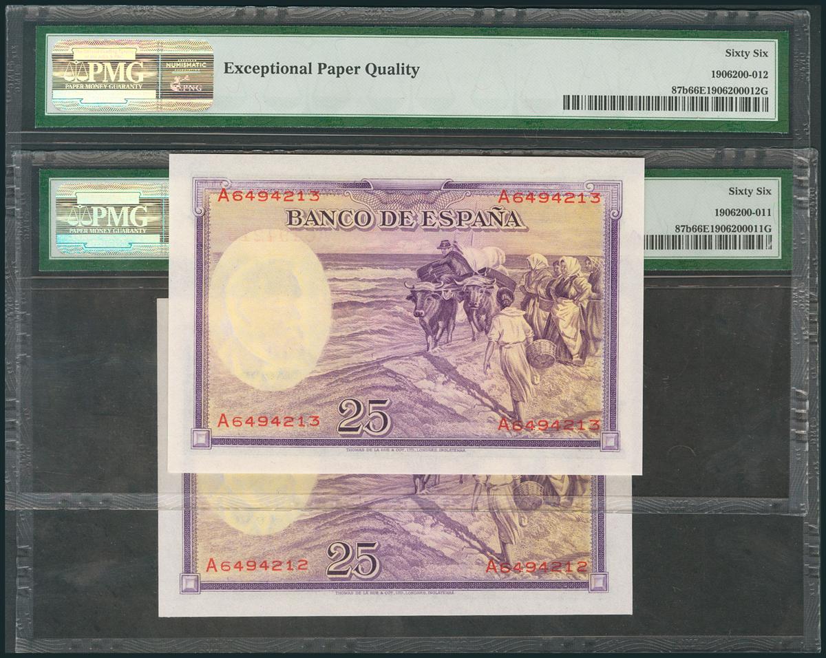25 Pesetas. 31 de Agosto de 1936. Serie A. Pareja correlativa. (Edifil 2017: 367a). SC. Encapsulado PMG 66EPQ, ambos.