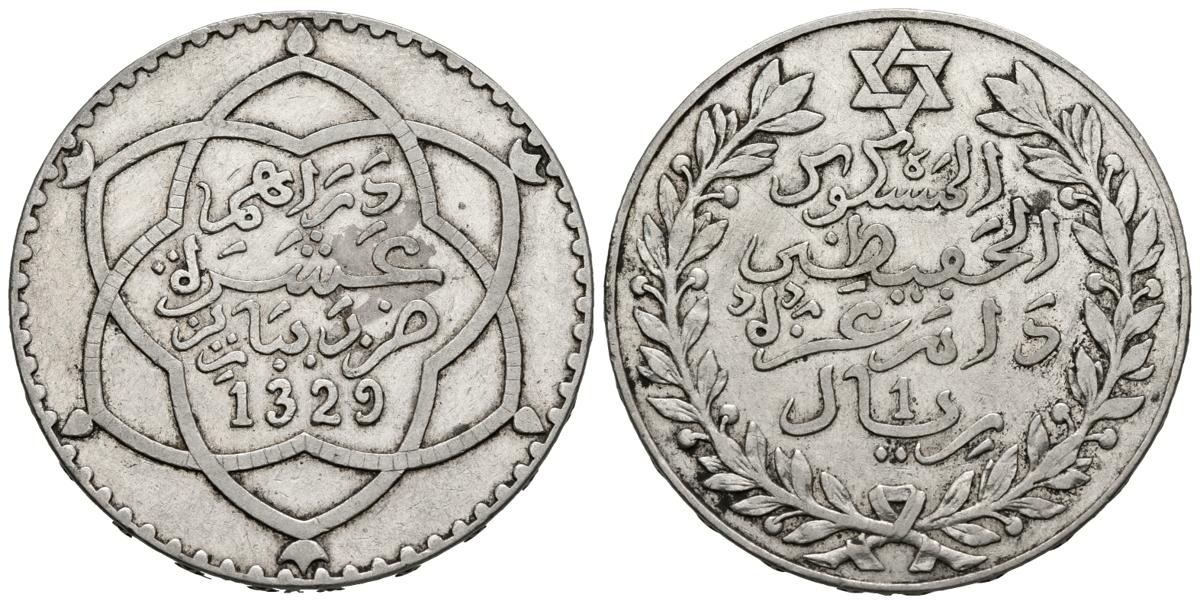 MARRUECOS. 10 Dirhams. (Ar. 24,84g/37mm). 1329H (1911). (Km#Y25). MBC+.