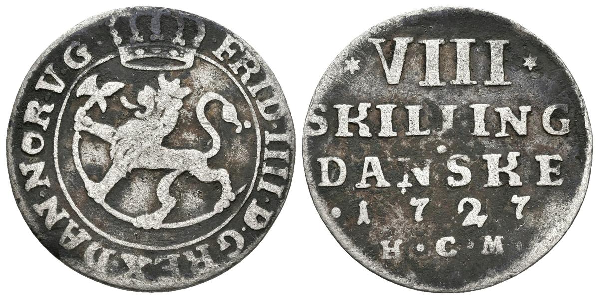 NORUEGA. Friedrich IV. 8 Skilling. 1727 H·C·M. KLH 17A Sieg 5.1. Ar. 2,58g. Algo sucia. BC+/MBC-. Escasa.