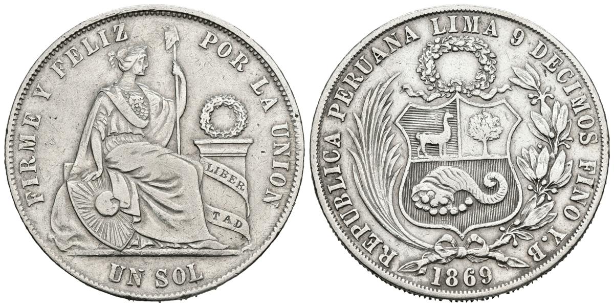 PERU. 1 Sol. (Ar. 24,72g/37mm). 1869. (Km#196). MBC+.