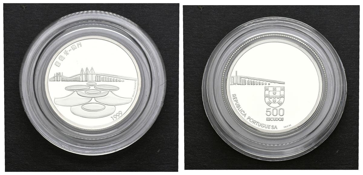 PORTUGAL. 500 Escudos. (Ar. 14,00g/30mm). 1999. "MACAU-PORTUGAL". (Km#723). PROOF. Incluye estuche oficial y certificado.