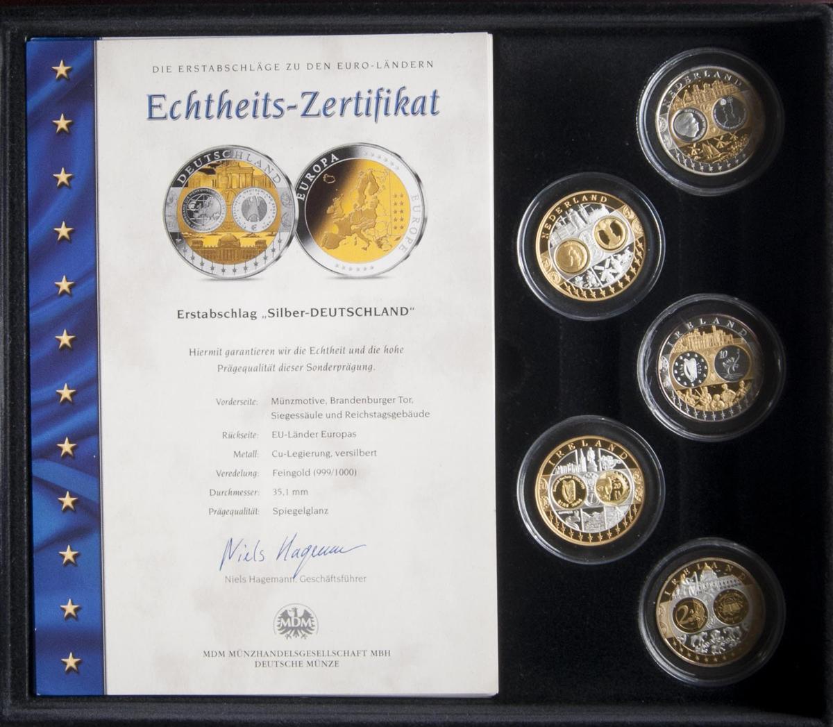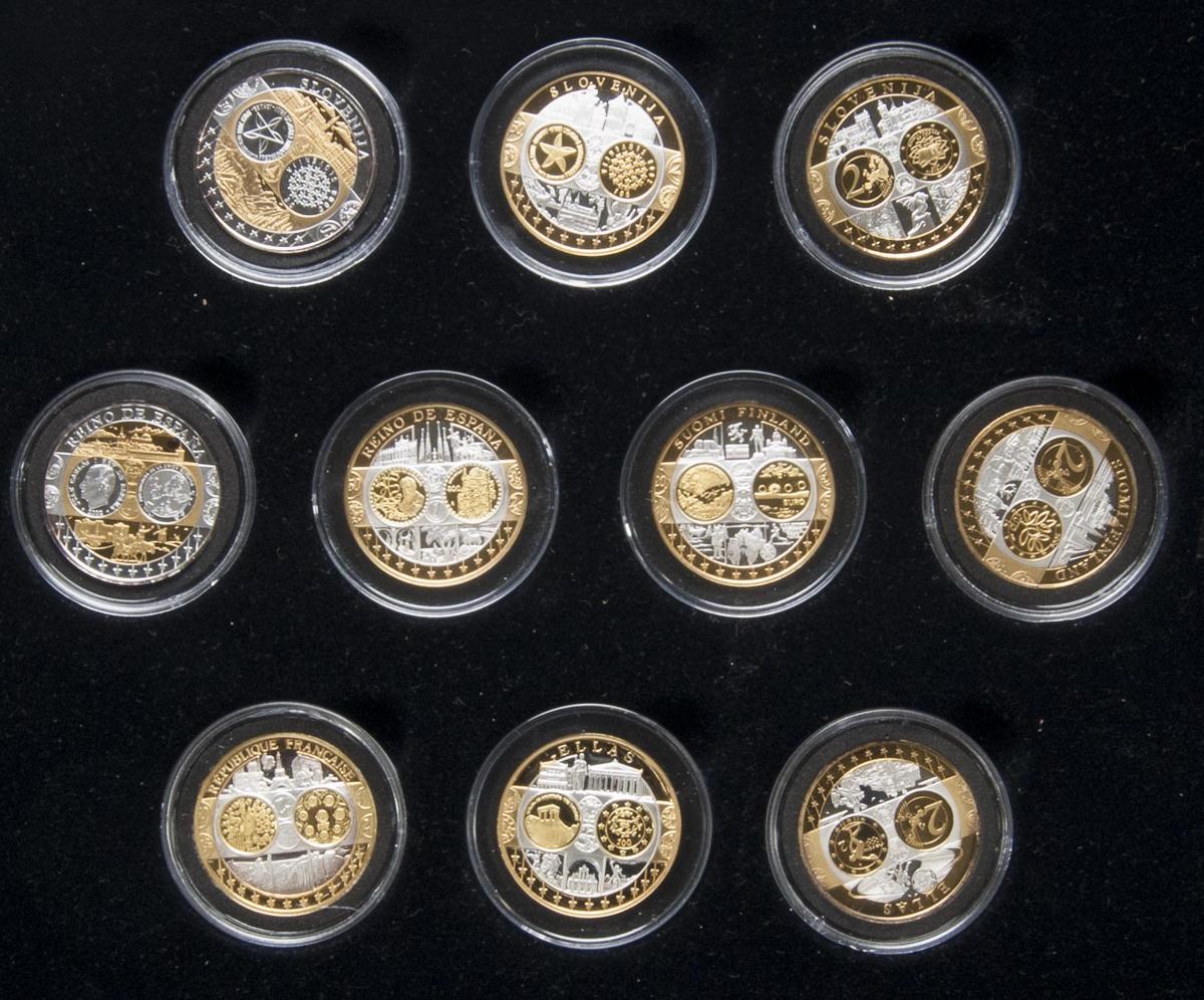 MONEDAS EXTRANJERAS. Precioso conjunto de 48 medallas conmemorativa de las primeras imágenes del Euro. (Cu-Ar-Au. 16,99g/35mm). PROOF. La colección no está completa, a falta de dos piezas, e incluye certificados y presentada en dos maletines.
