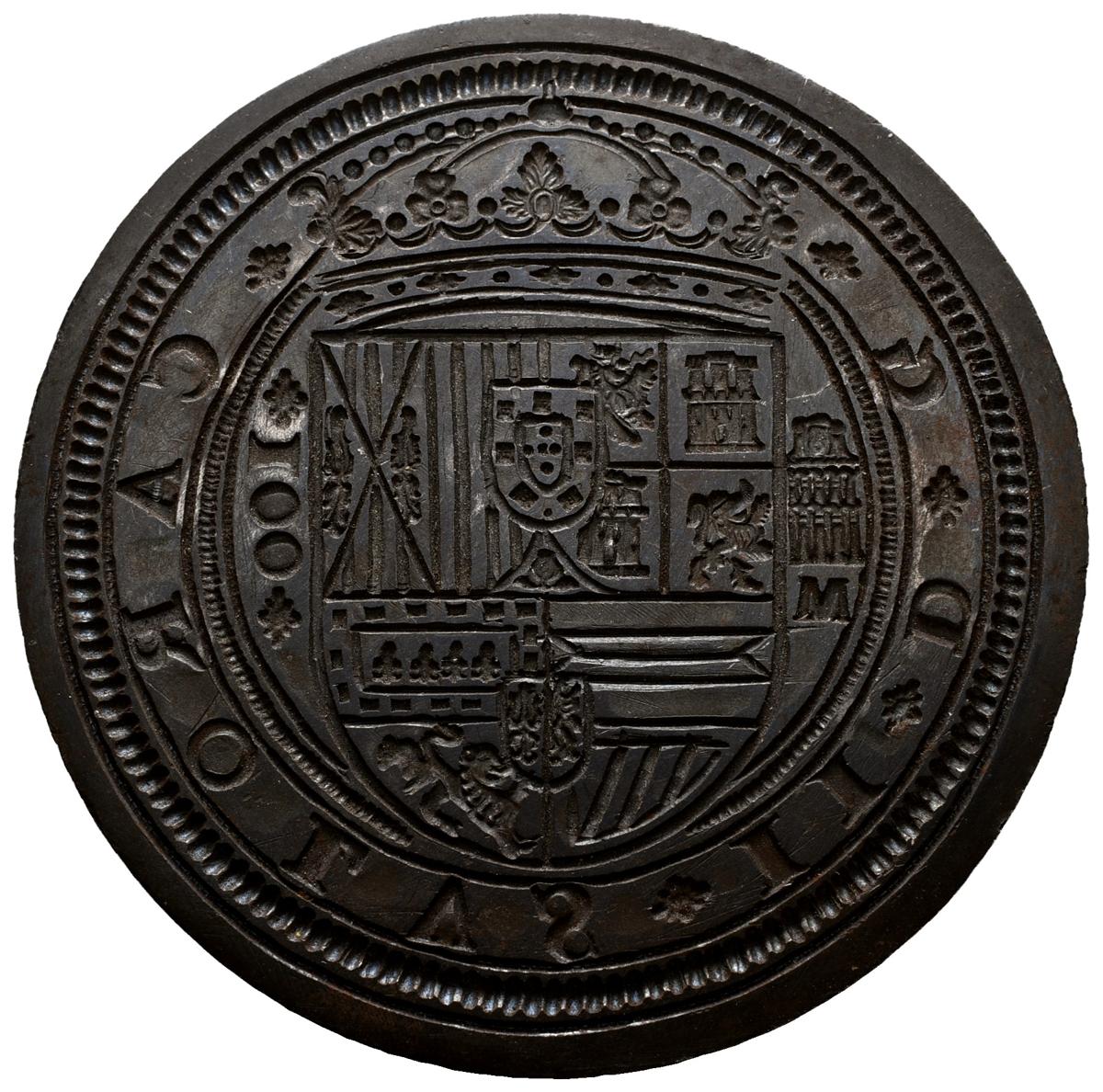 Reproducción antigua del cuño del anverso de un 100 Escudos de Carlos II de Segovia. EBC.
