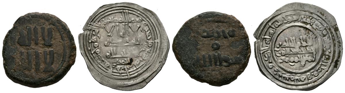 HISPANO ARABE. Conjunto de 2 monedas del Califato de Córdoba y de los Gobernadores Omeyas de Al-Andalus. Dirham y Felus en plata y cobre respectivamente. Diferentes estados de conservación. A EXAMINAR.