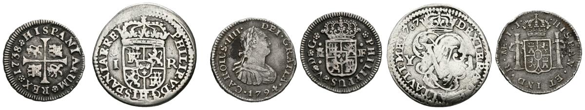 MONARQUIA ESPAÑOLA. Conjunto formado por 3 piezas de plata de 1/2 y 1 Real de los reinados de Felipe V y Carlos IV. Diferentes estados de conservación. A EXAMINAR.