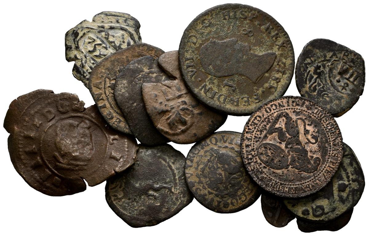 MONARQUIA ESPAÑOLA y GOBIERNO PROVISIONAL. Lote compuesto por 11 monedas de cobre de distintos reyes y un 5 Céntimos de 1870. BC+/MBC.